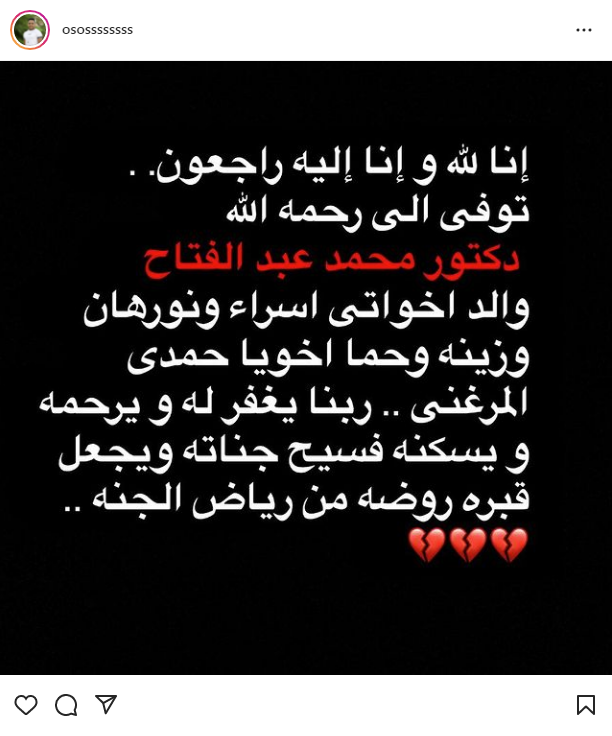 ووجه الفنان محمد أسامة (أوس أوس) رسالة نعي للراحل عبر حسابه الشخصي على موقع الصور الشهير "انستجرام" قائلا: "إنا لله وإنا إليه راجعون.. توفي إلى رحمة الله دكتور محمد عبد الفتاح.. والد اخواتي اسراء ونورهان وزينة وحما اخويا حمدي الميرغني.. ربنا يغفر له ويرحمه ويسكنه فسيح جناته ويجعل قبره روضه من رياض الجنة".