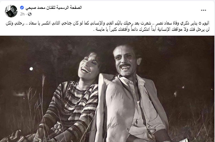 حرص الفنان محمد صبحي على إحياء ذكرى وفاة الفنانة سعاد نصر، عبر حسابه الشخصي على موقع التواصل الاجتماعي "فيس بوك"، حيث رحلت عن عالمنا في مثل هذا اليوم الموافق 5 يناير.