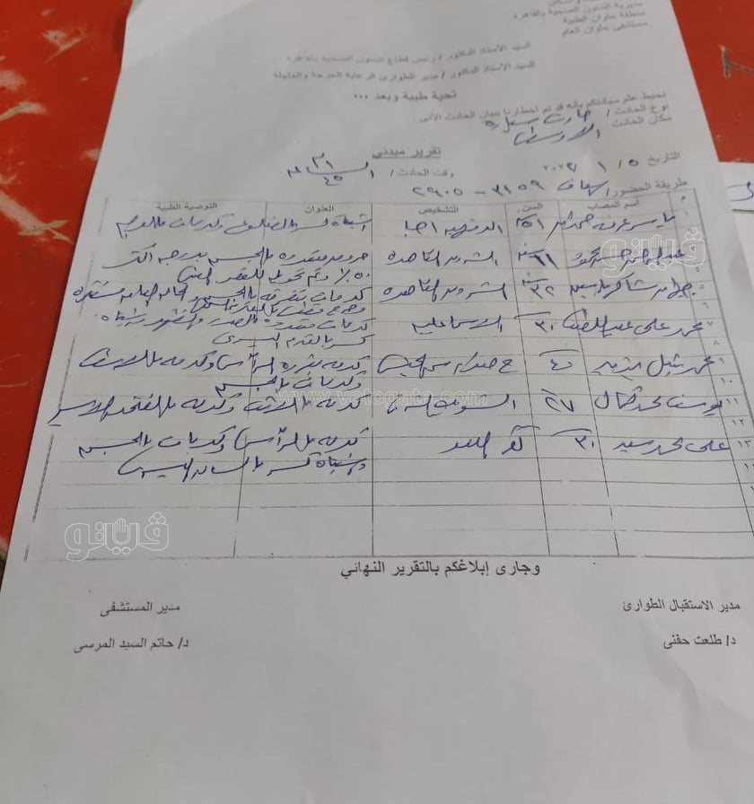 حصلت فيتو على التقرير الطبى المبدئى لمصابى حادث تصادم 11 سيارة ملاكى ونقل وأجرة بنفق الدائرى الأوسطى أسفل محور الأوتوستراد بدائرة قسم شرطة 15 مايو.