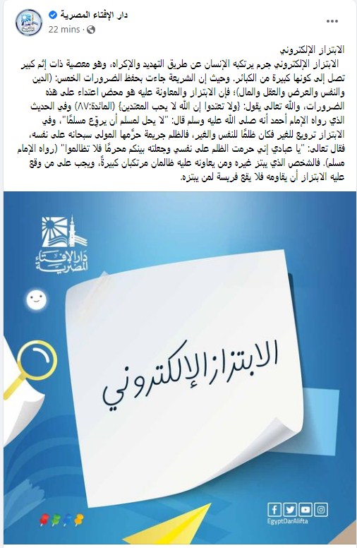 وكتبت دار الإفتاء تدوينة على الفيس بوك قائلة: "الابتزاز الإلكتروني جرم يرتكبه الإنسان عن طريق التهديد والإكراه، وهو معصية ذات إثم كبير تصل إلى كونها كبيرة من الكبائر"