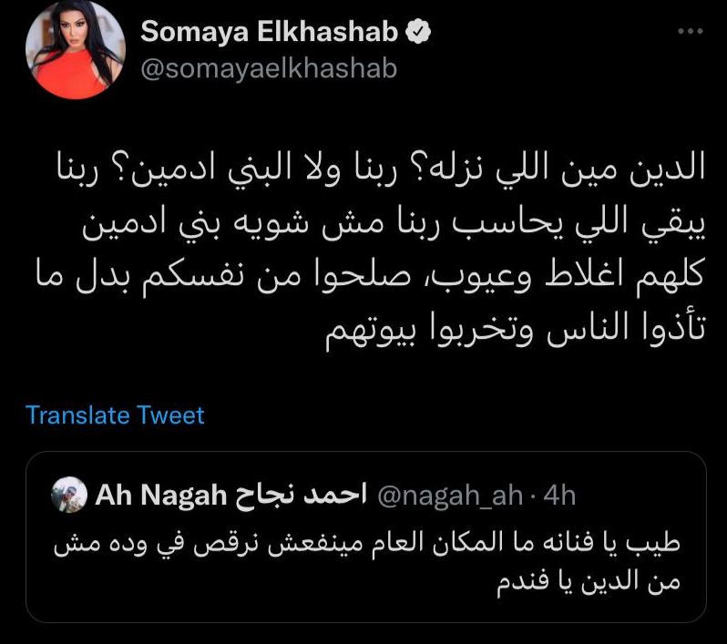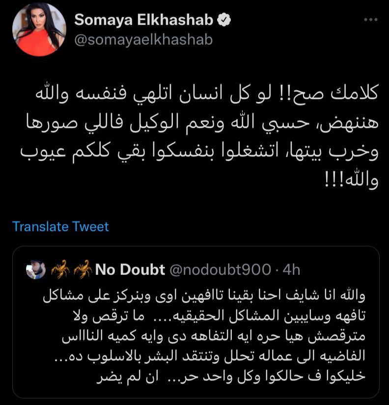 وكتبت سمية الخشاب، منشورًا عبر موقع التغريدات القصيرة “تويتر"، وقالت: لو كل إنسان اتلهي في نفسه والله هننهض، حسبي الله ونعم الوكيل في اللي صورها وخرب بيتها، انشغلوا بنفسكوا بقى كلكم عيوب.. والله الدين مين اللي نزله؟ ربنا ولا البني آدمين؟، ربنا يبقي اللي يحاسب ربنا مش شوية بني آدمين كلهم غلط وعيوب، صلحوا من نفسكم بدل ما تأذوا الناس وتخربوا بيوتهم.