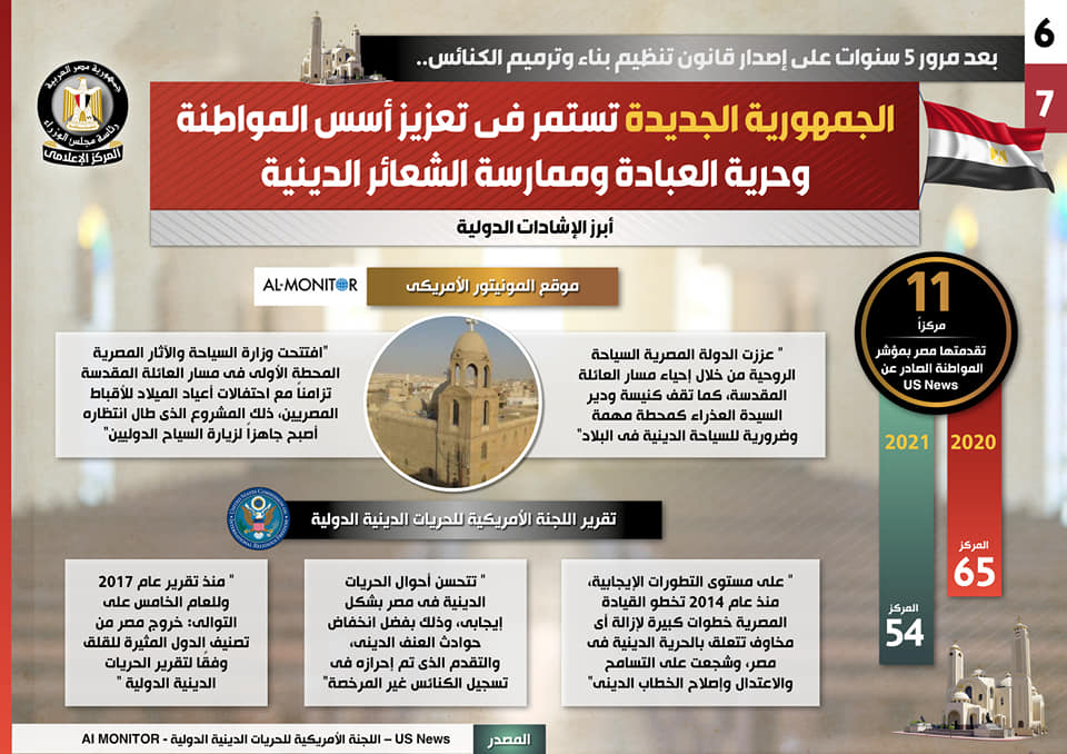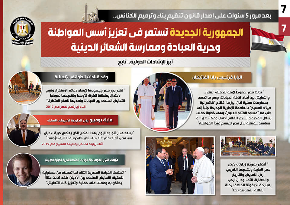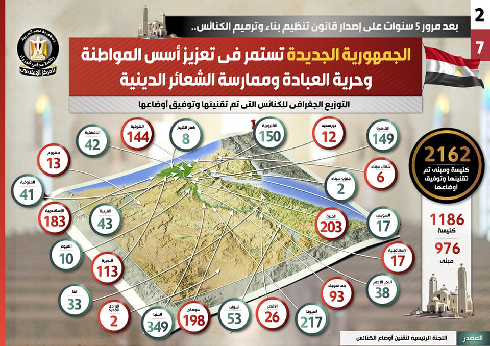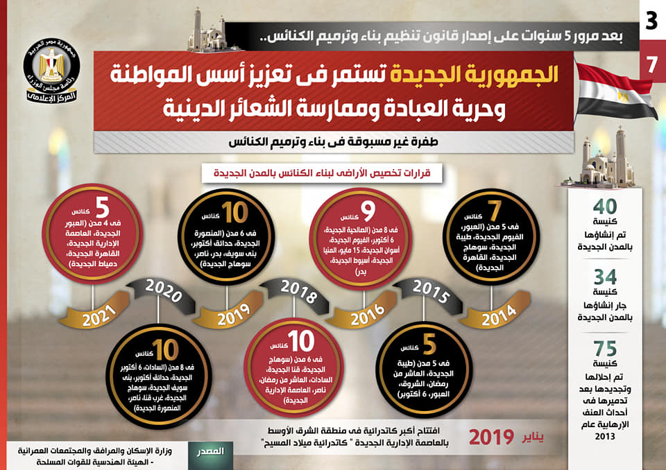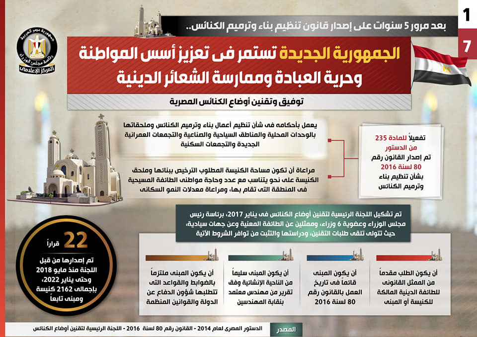 وفي هذا الصدد نشر المركز الإعلامي لمجلس الوزراء تقريرًا تضمن إنفوجرافات تسلط الضوء على استمرار الجمهورية الجديدة في تعزيز أسس المواطنة وحرية العبادة وممارسة الشعائر الدينية، وذلك بعد مرور 5 سنوات على إصدار قانون تنظيم بناء وترميم الكنائس.