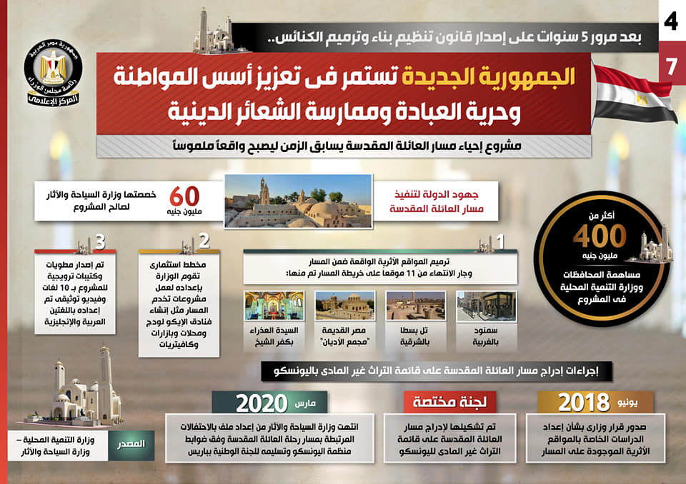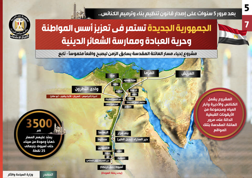 وإلى جانب ما سبق، تناول التقرير الحديث عن مشروع إحياء مسار العائلة المقدسة، حيث تسابق الدولة الزمن ليصبح واقعًا ملموسًا، والذي يشمل الكنائس والأديرة وآبار المياه ومجموعة من الأيقونات القبطية الدالة على مرور العائلة المقدسة بتلك المواقع، علمًا بأنه يمتد على 3500 كم ذهابًا وعودة من سيناء حتى أسيوط، بإجمالي 25 نقطة.