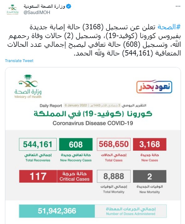 وكتبت وزارة الصحة السعودية تغريدة على تويتر "#الصحة تعلن عن تسجيل (3168) حالة إصابة جديدة بفيروس كورونا (كوفيد-19)، وتسجيل (2) حالات وفاة رحمهم الله، وتسجيل (608) حالة تعافي ليصبح إجمالي عدد الحالات المتعافية (544،161) حالة ولله الحمد".