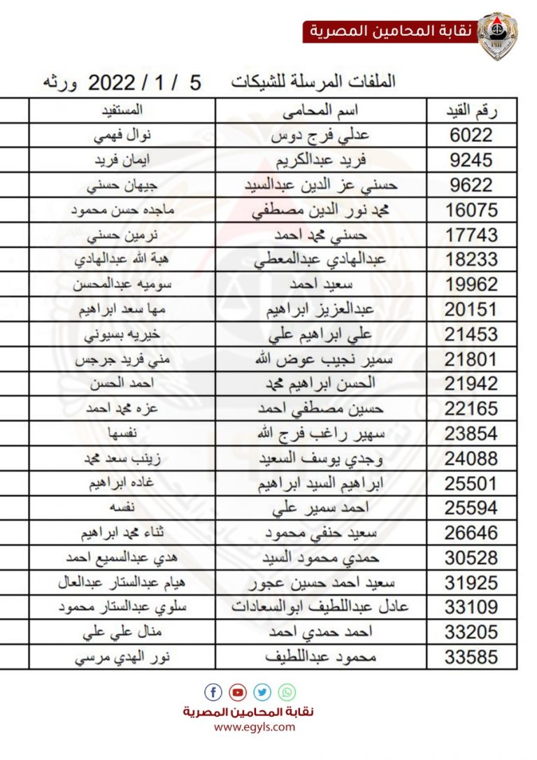 وبالنسبة للورثة أوضح الأمين العام المساعد، أنه تم أيضّا مراجعة ما يقرب من 101 ملف لمستحقي المعاش من ورثة المحامين المتوفين وإحالتها إلى الإدارة المالية أيضًا من يوم السبت الموافق 8 يناير الجاري، وذلك لقيام الإدارة المالية باتخاذ إجراءاتها نحو تحرير الشيكات أيضًا والإحالة إلى البنوك لصرف المعاش الشهري لمستحقي المعاش من ورثة المحامين المتوفين والواردة أسمائهم في الكشوف التالية.