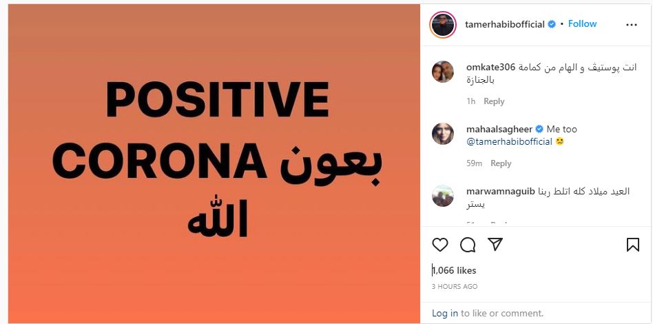 وأوضح تامر حبيب إصابته بفيروس كورونا عبر حسابه على انستجرام حيث كتب: "إيجابي كورونا بعون الله، قدر الله وما شاء فعل"، لترد مها الصغير كاتبة.