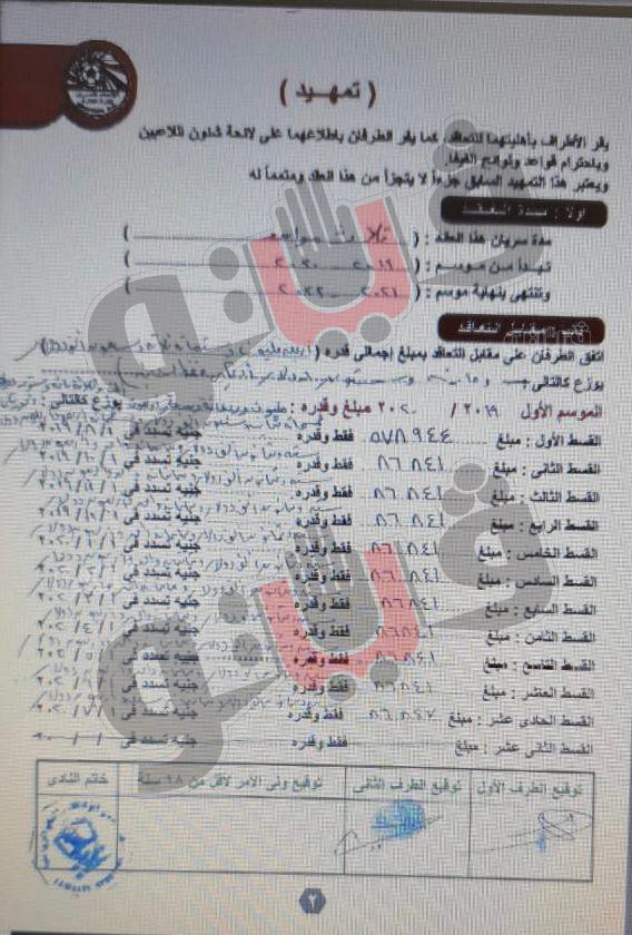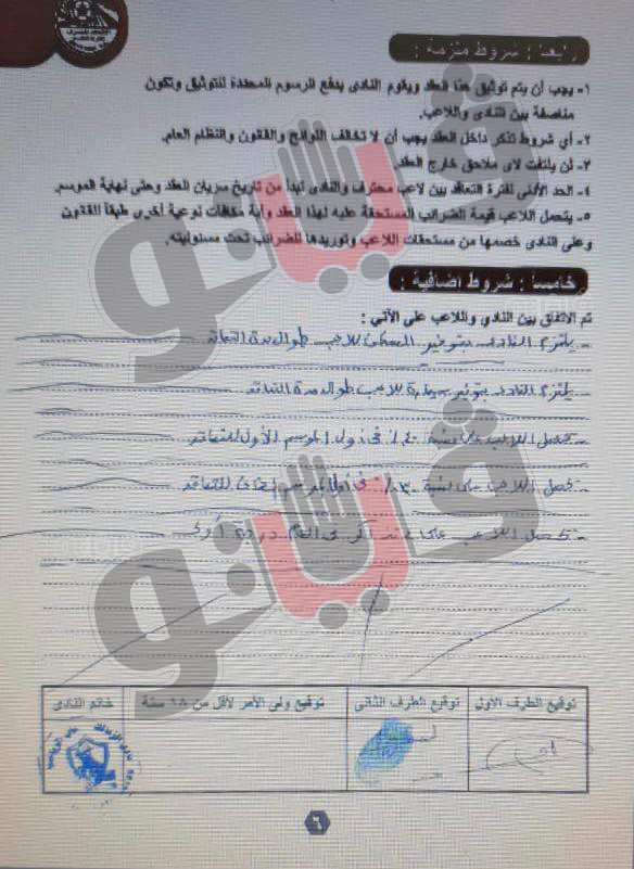 كما ينص العقد أيضا في الشروط الإضافية على تحمل اللاعب قيمة الضرائب أما رسوم التوثيق فتكون مناصفة بين اللاعب والنادي بالاضافة الى أن العقد ينتهي بنهاية الموسم الكروي.
