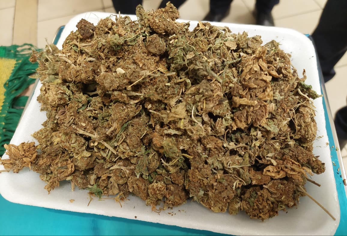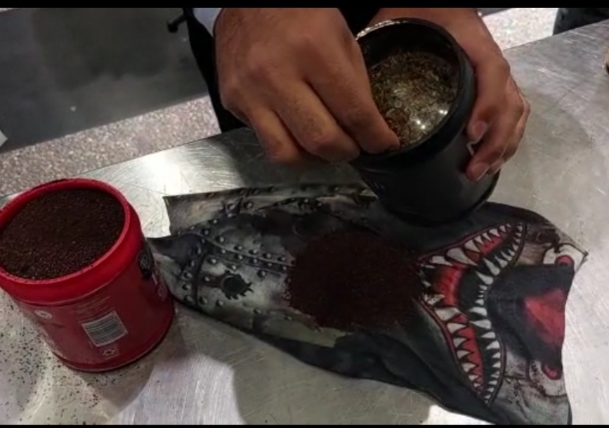 ثانيا: تم ضبط كمية من عشب الماريجوانا تزن ٢٢٠ جرام في برطمان أسفل البن وكذلك ١١ قطعة بها زيت الماريجوانا تستخدم في السجائر الإلكترونية ثالثا: تم ضبط ٣٤ تليفون محمول خبأهم الراكب بين طيات الملابس بحقائبه.