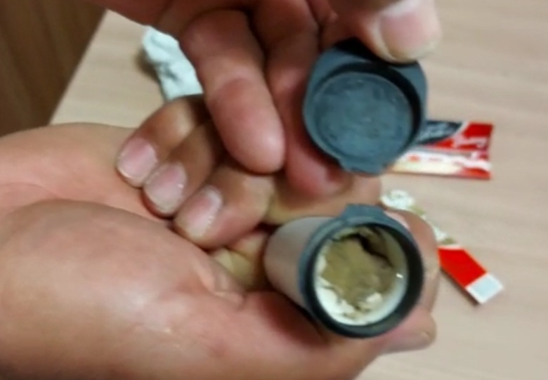 وبتفتيش حقائبه علي جهاز الفحص بالأشعة بواسطة كل من أحمد مدحت فهمي مأمور الجمرك ومحمد صابر رئيس القسم واللذان تلاحظ لهما وجود شرائط دوائية، قام عمرو عبد العزيز العميري مدير الحركة المشرف على صالة الوصول بمبني الركاب رقم ٢ بتكليف احمد عبد الرشيد زيدان مأمور الجمرك بتفتيش حقائب الراكب يدويا مما اسفر عن ضبط شرائط لعقار الترامادول المخدر باجمالي ٩٤ قرص وقطعة حشيش مخبأة داخل فردة حذاء بحقيبة الراكب وقطع حشيش اخري صغيرة داخل علبة بلاستيك صغيرة في جيب في احد ملابس الراكب بالحقيبة باجمالي ٦١ جرام.