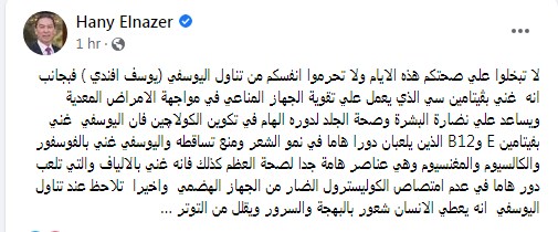وكتب هاني الناظر تدوينة على الفيس بوك "لا تبخلوا علي صحتكم هذه الأيام ولا تحرموا أنفسكم من تناول اليوسفي (يوسف افندي ) فبجانب أنه غني بڤيتامين سي الذي يعمل علي تقوية الجهاز المناعي في مواجهة الأمراض المعدية".