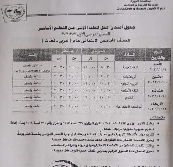 جدول امتحانات الترم الأول للصف الخامس الابتدائي 2021