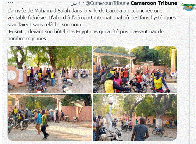 وبحسب نشطاء على مواقع التواصل الإجتماعي من الكاميرون، فقد تجمع عدد كبير من جماهير مدينة جاروا الكاميرونية أمام المطار لاستقبال محمد صلاح، وهتفوا باسمه، كما تجمعوا أمام فندق إقامة منتخب مصر لرؤوية ومشاهدة محمد صلاح، وحاولوا اقتحام الفندق.