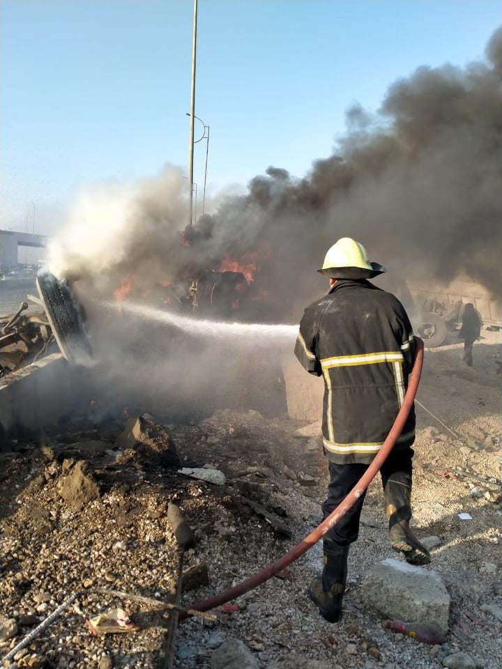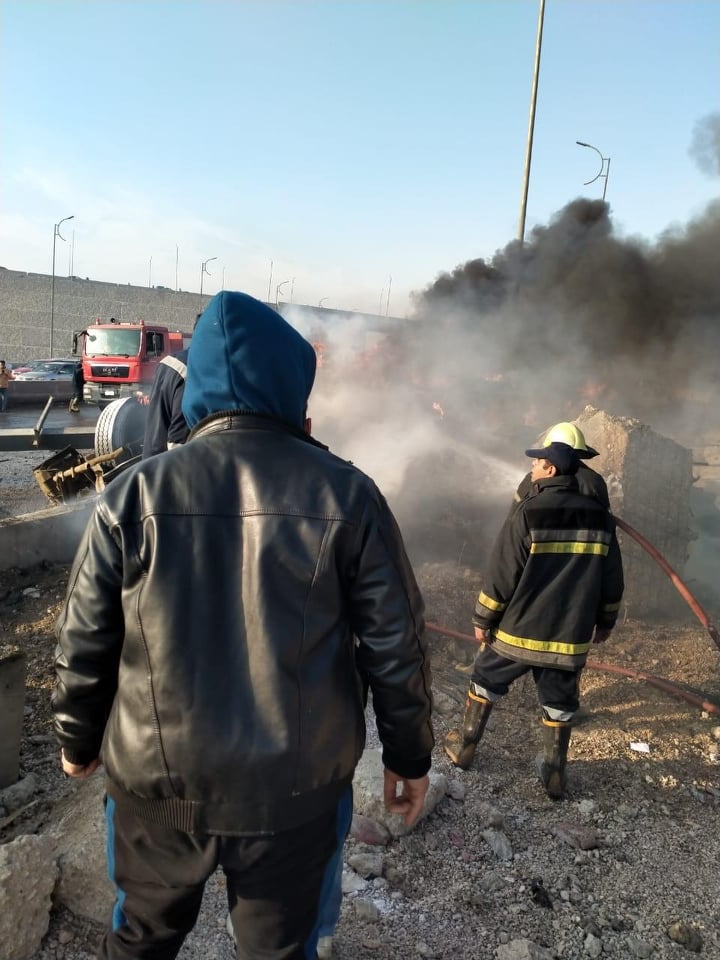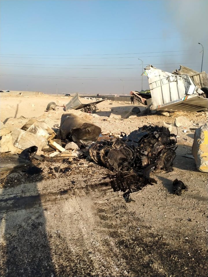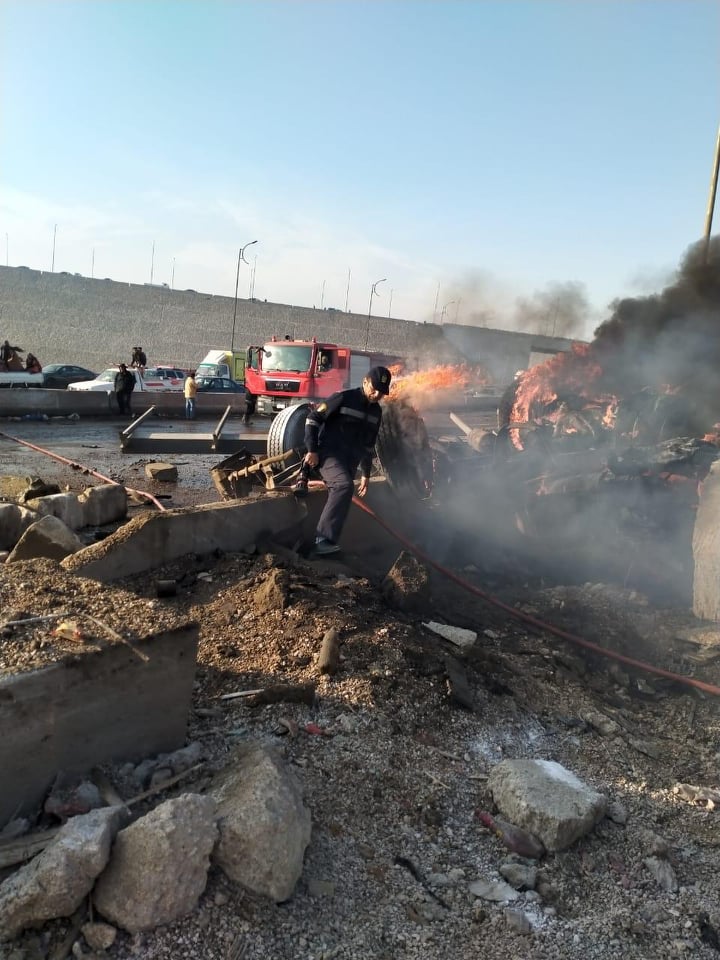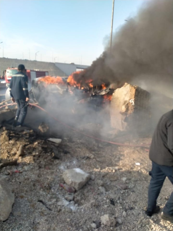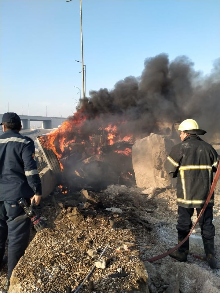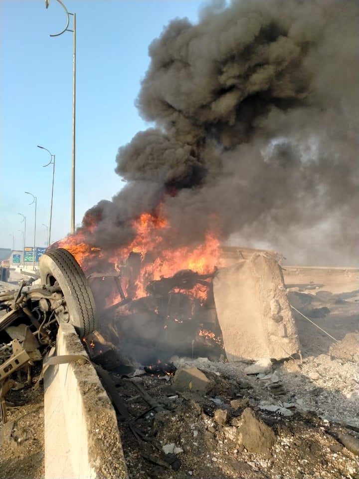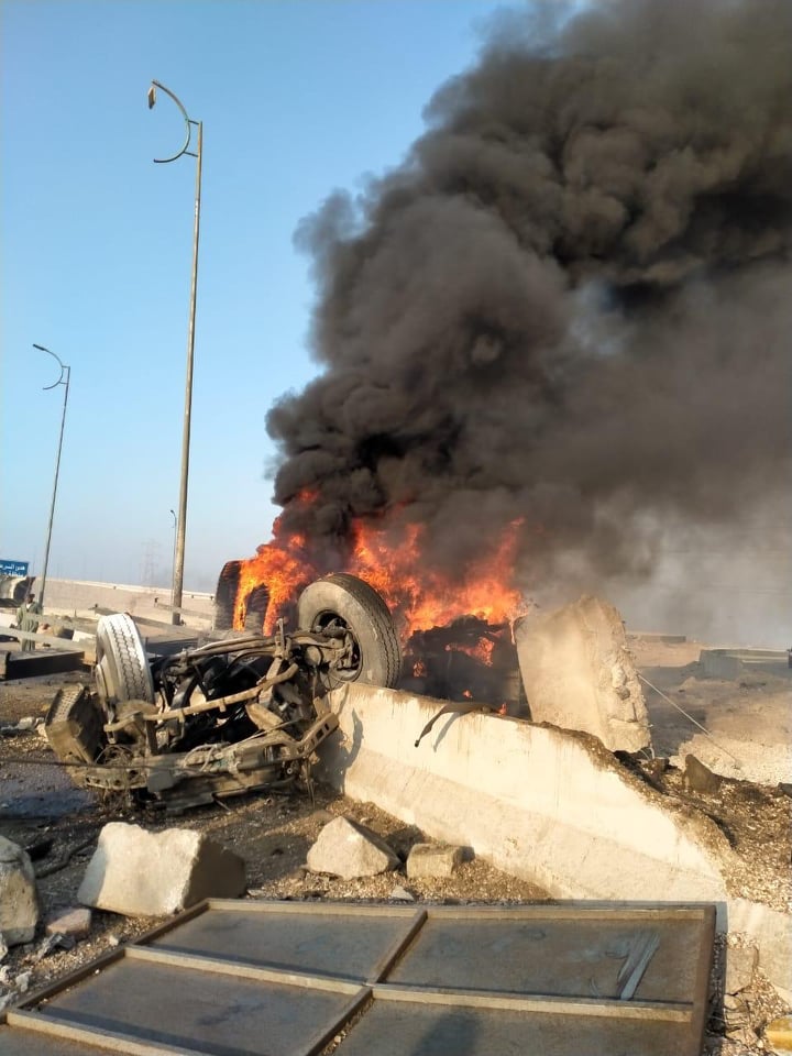 تفحم شخصين في انقلاب سيارة نقل وانفجارها على الدائري الأوسطي | صور