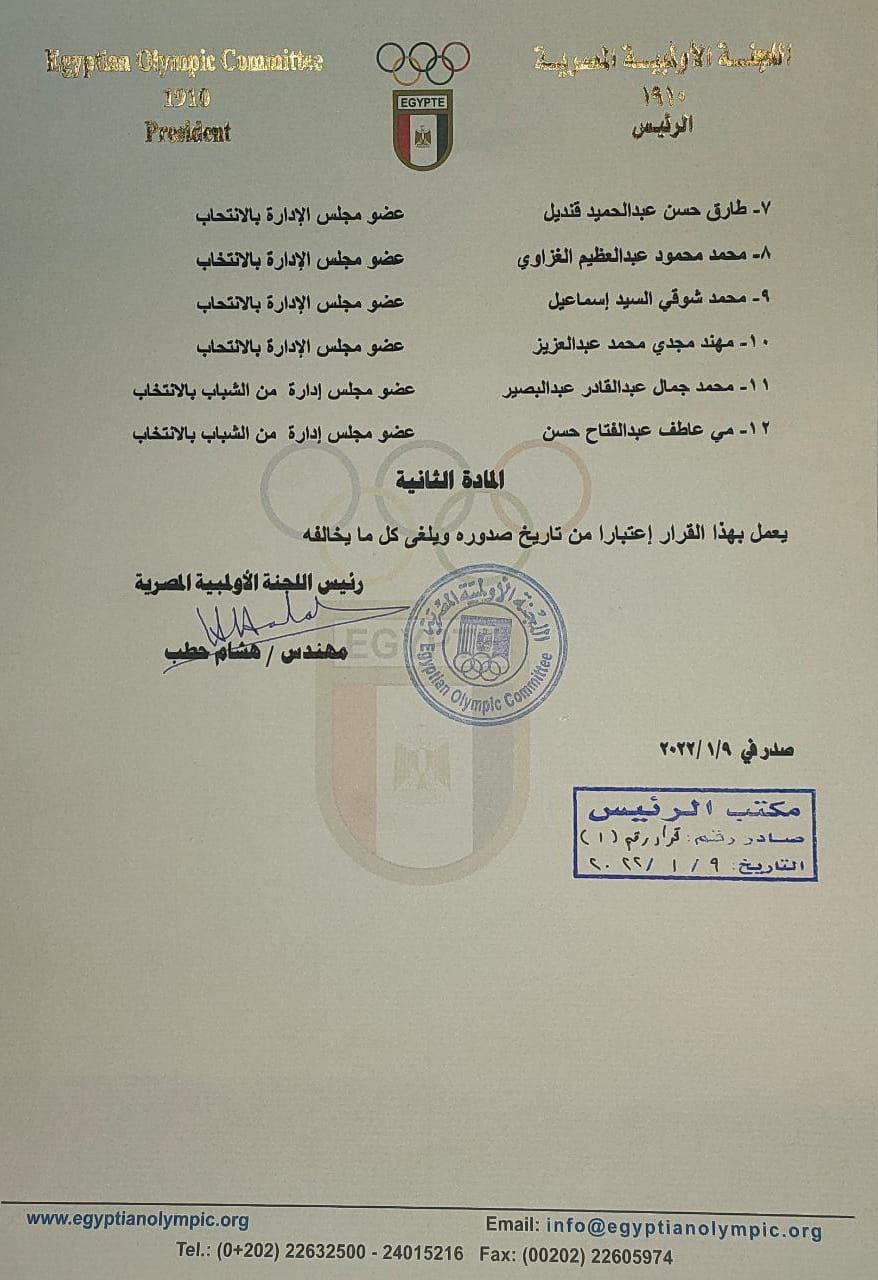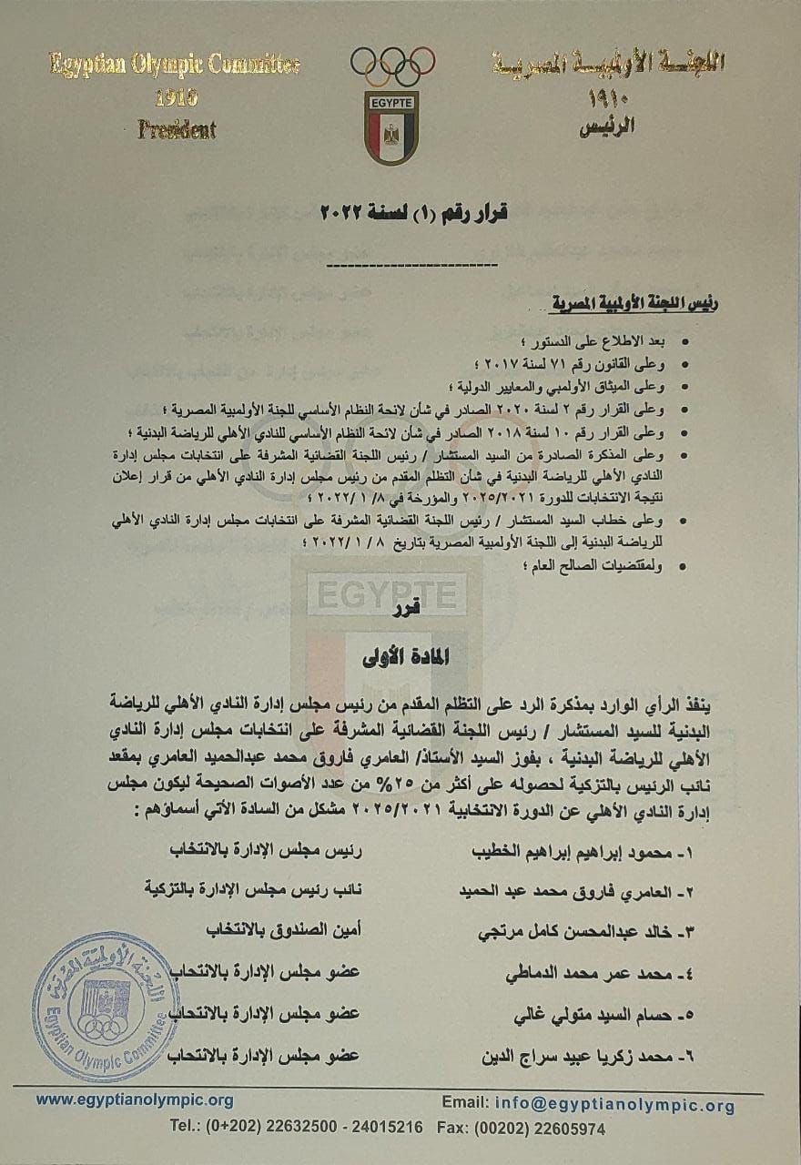 أصدر مجلس إدارة اللجنة الأولمبية برئاسة المهندس هشام حطب القرار رقم (1) لسنة 2022 والذي ينص على اعتماد وجود العامري فاروق في تشكيل مجلس إدارة النادي الأهلي بناء على قرار اللجنة القضائية المشكلة للإشراف على انتخابات النادي الأهلي.