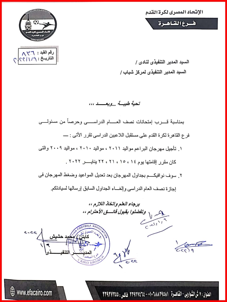 تأجيل مباريات براعم منطقة القاهرة أسبوعين بسبب الامتحانات الدراسية