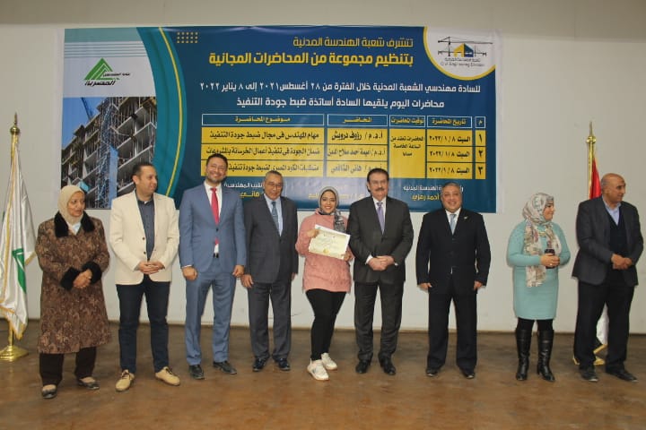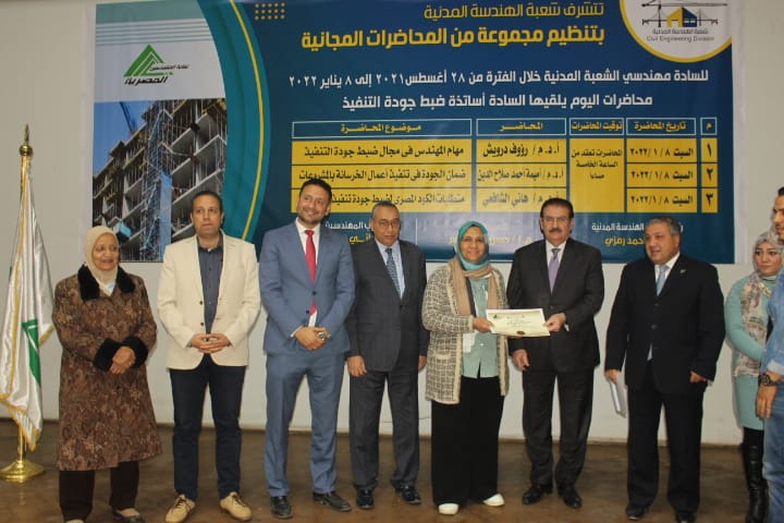 وكانت شعبة الهندسة المدنية، اختتمت سلسلة محاضراتها المجانية الـ42، والتي تواصلت على مدى 6 شهور، بحضور المهندس هاني ضاحي، نقيب المهندسين، والمهندس حسن عبدالعليم، أمين عام النقابة، والمهندس أحمد حشيش، أمين الصندوق المساعد والمتحدث الإعلامي لنقابة المهندسين، والمهندس أحمد رمزي، رئيس شعبة الهندسة المدنية، والمهندس محمد الحسيني، عضو المجلس الأعلى وأمين الشعبة، والمهندس خالد توكل، عضو المجلس الأعلى وعضو الشعبة، والمهندسة منال سري، عضو الشعبة المدنية والمهندسة شاهندة، عضو شعبة الهندسة المدنية.