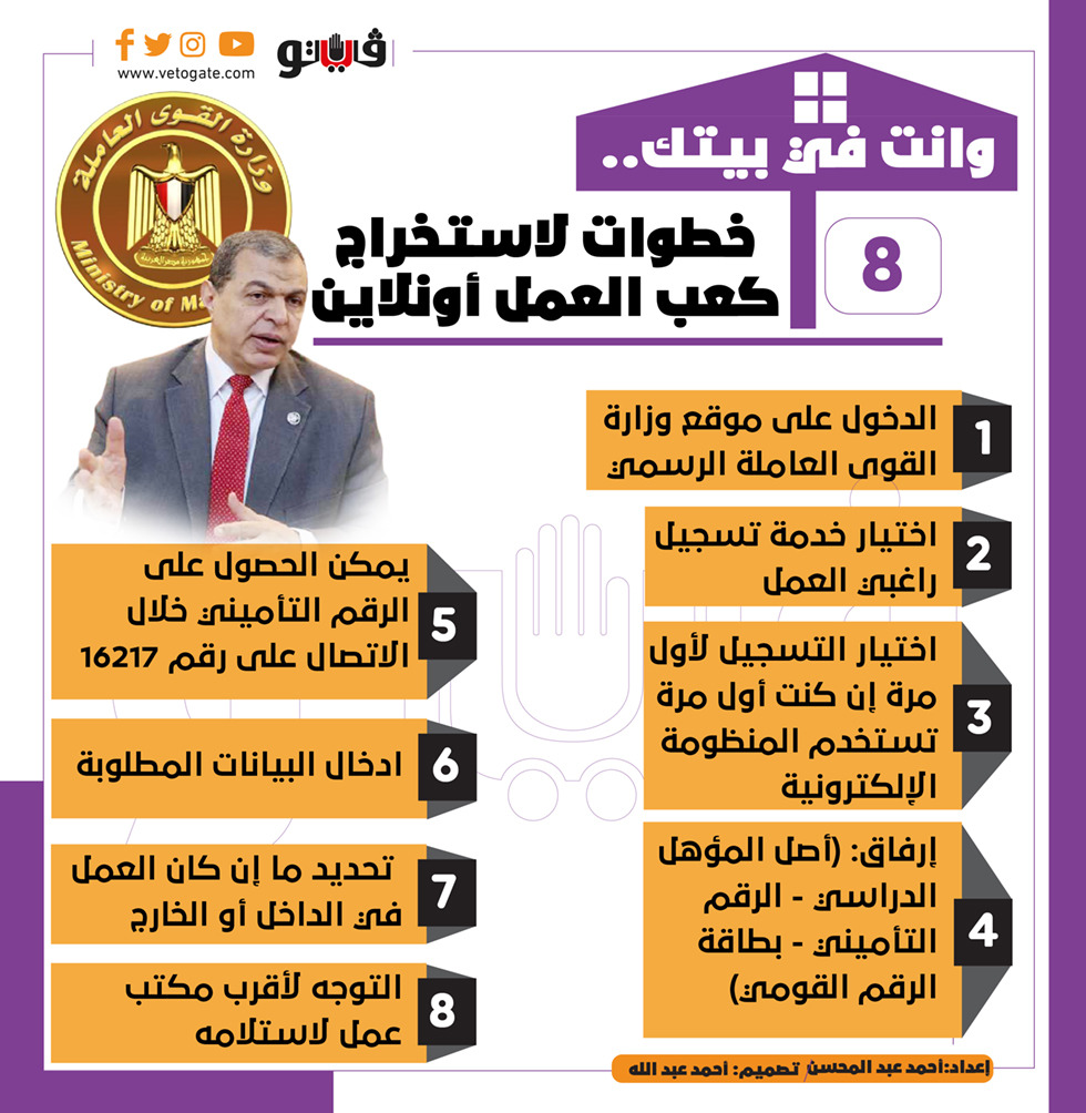 وانت في بيتك.. 8 خطوات لاستخراج كعب العمل أونلاين | انفوجراف الأربعاء 12/يناير/2022 - 06:10 م 1/12/2022 6:10:30 PM وزير القوي العاملة محمد سعفان أحمد عبدالمحسن شارك طباعة 18 حجم الخط شارك طباعة وزارة القوى العاملة بطاقة الرقم القومى المؤهل الدراسي موقع وزارة القوى العاملة القوى العاملة خطوات استخراج كعب العمل
