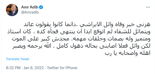 وكتب عمرو أديب قائلا: "هزنى خبر وفاة وائل الابراشي.. دائما كانوا يقولون عائد ويتماثل للشفاء لم اتوقع أبدا أن ينتهى فجأة كده.. كان أستاذا ومتميزا وله بصمات وحلقات مهمة.. محدش كبير على الموت لكن وائل فعلا أصابني بحالة ذهول كامل.. الله يرحمه ويصبر أهله وأصحابه يا رب".