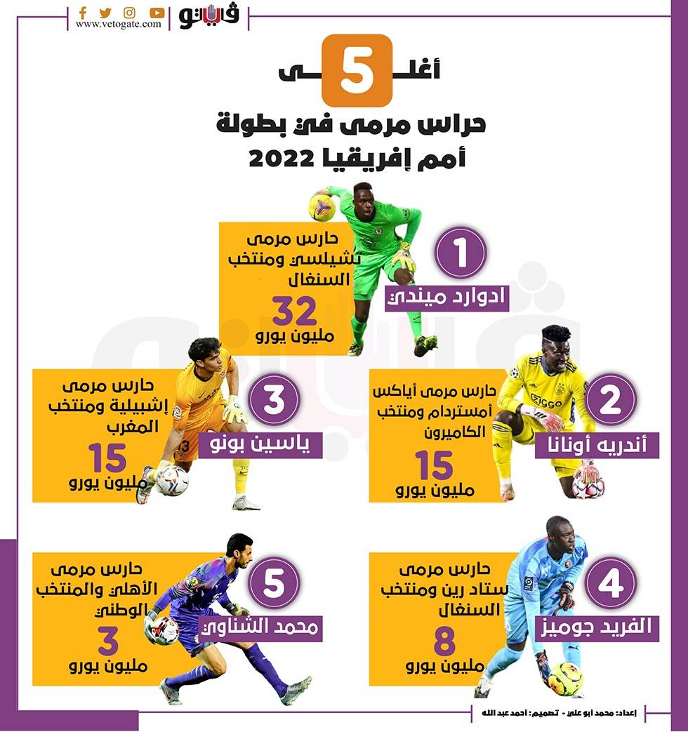أغلى 5 حراس مرمى في بطولة أمم إفريقيا 2022 | انفوجراف الإثنين 10/يناير/2022 - 11:55 ص 1/10/2022 11:55:13 AM محمد الشناوي محمد ابو على شارك طباعة 18 حجم الخط شارك طباعة إدوارد ميندي محمد الشناوي أخبار بطولة أمم أفريقيا أخبار منتخب مصر لكرة القدم اندرية اونانا