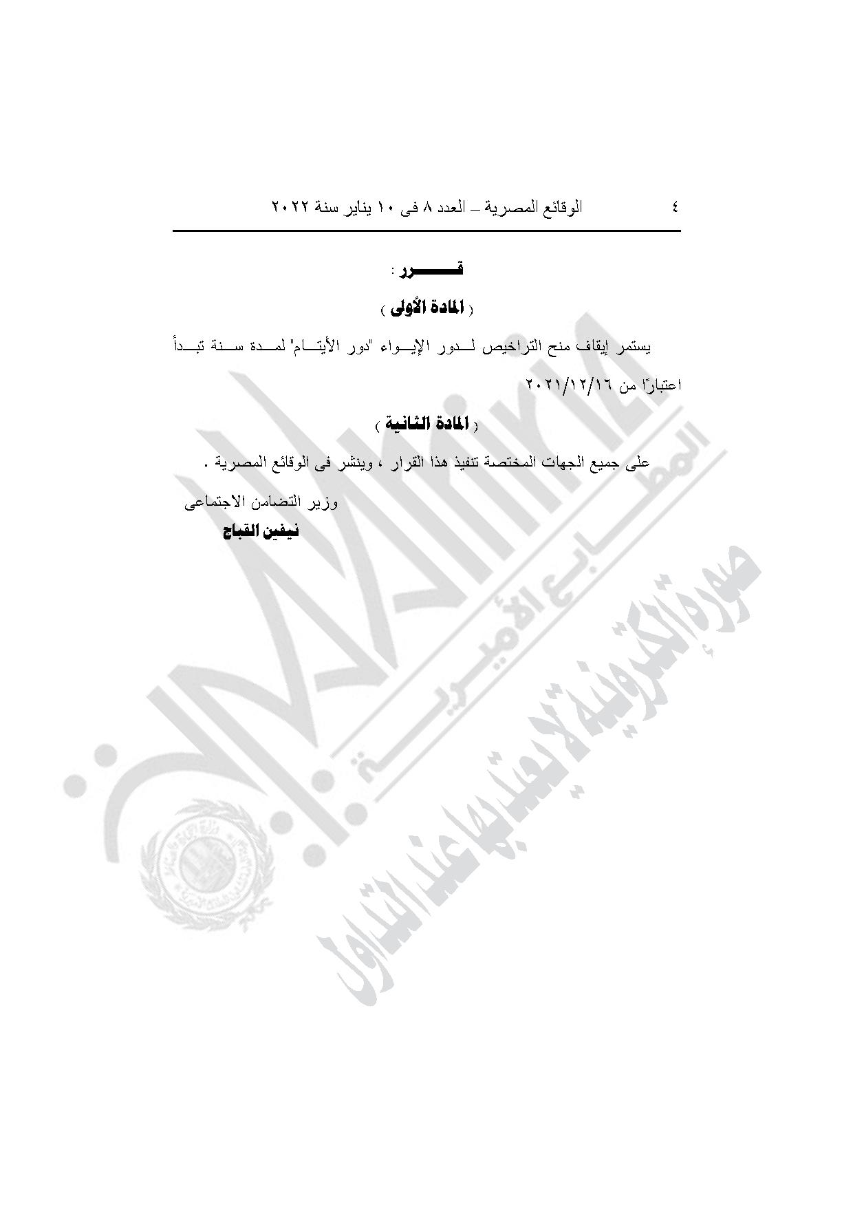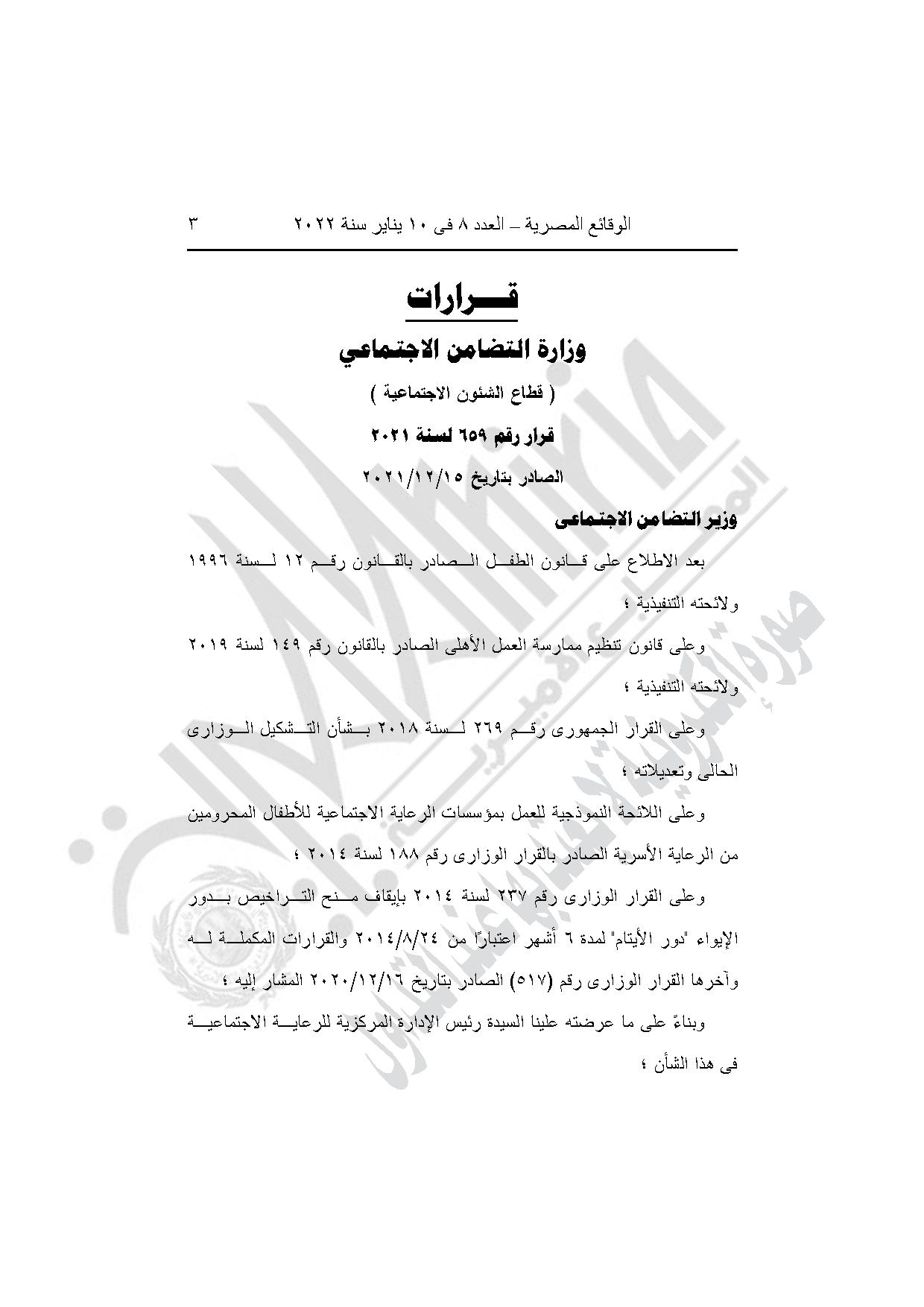 نشرت جريدة الوقائع المصرية في العدد 8، الصادر في 10 يناير 2022، قرار وزارة التضامن الاجتماعي رقم 659 لسنة 2021، باستمرار إيقاف منح التراخيص لدور الأيتام لمدة سنة.