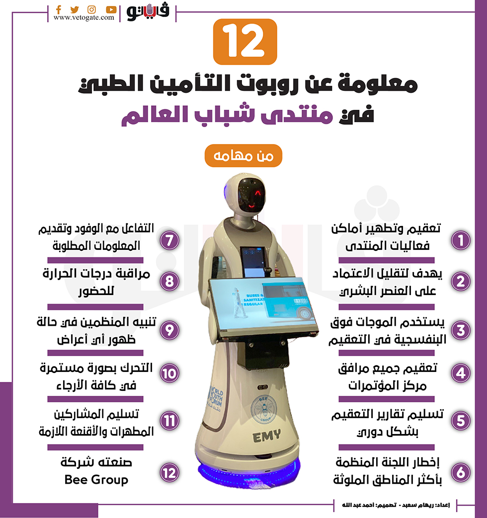 12 معلومة عن روبوت التأمين الطبي في منتدى شباب العالم | انفوجراف الإثنين 10/يناير/2022 - 04:20 م 1/10/2022 4:20:08 PM 12 معلومة عن روبوت التأمين الطبي في منتدى شباب العالم ريهام سعيد شارك طباعة 18 حجم الخط شارك طباعة درجات الحرارة منتدى شباب منتدى شباب العالم تعقيم وتطهير فوق البنفسجية