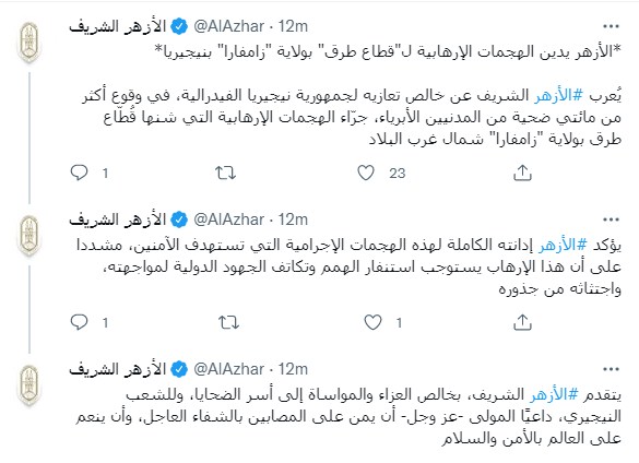 - الأزهر يدين الهجمات الإرهابية ل"قطاع طرق" بولاية "زامفارا" بنيجيريا.