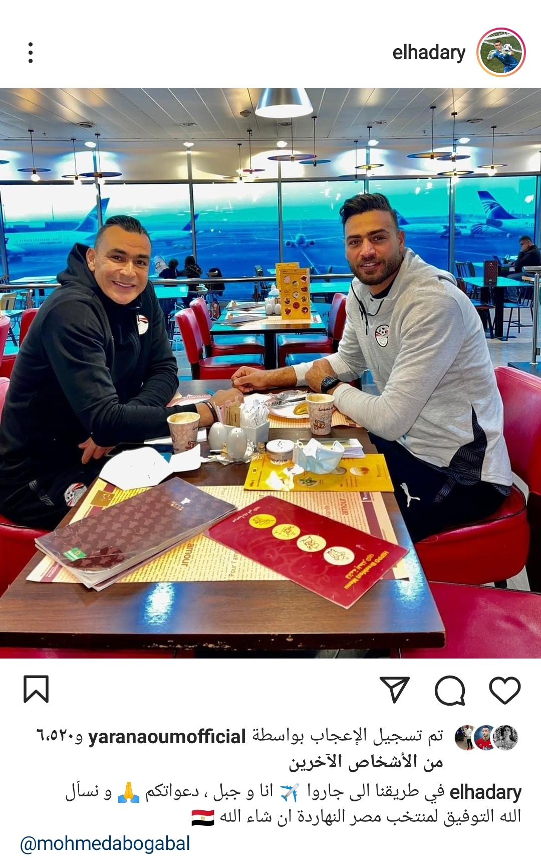 نشر عصام الحضرى مدرب حراس المرمى فى المنتخب الوطنى، صورة عبر حسابه على موقع "إنستجرام" استعدادا للسفر إلى الكاميرون برفقته محمد أبو جبل، بعد شفائهما من فيروس كورونا، حيث ظهر الحضرى وأبو جبل، داخل المطار قبل انطلاق رحلتهما للانضمام إلى منتخب مصر.