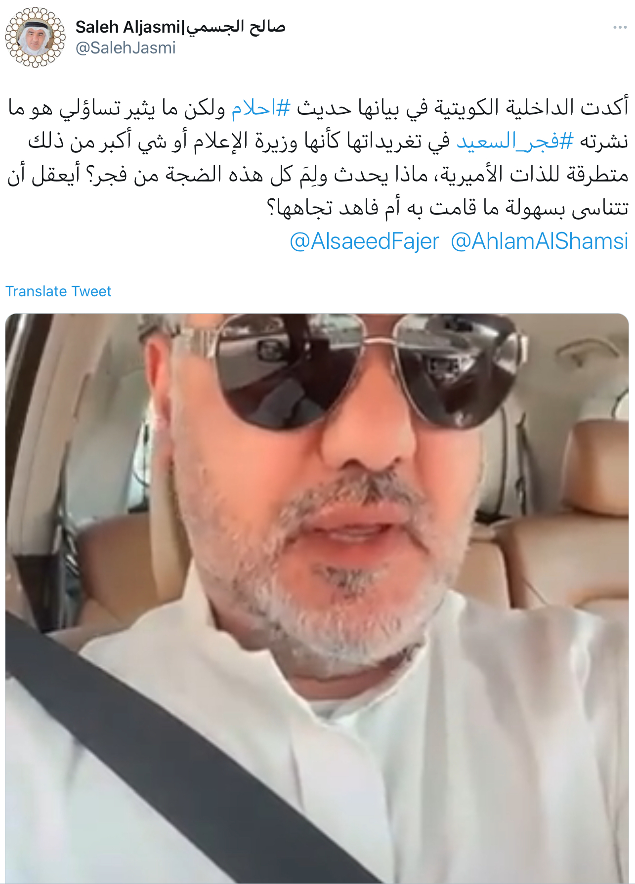 وأضاف صالح الجسمي ”فجر السعيد، إنتي شو مشكلتك، بسرعة ما انقلبتي مسوية سلسة تغريدات تهاجمي فيها أحلام عشان نادت سمو الأمير، إيش فيها لما نادت سمو الأمير أو ولي العهد، إحنا في الدول الخليجية اللي حببنا لقادتنا وشيخونا أنهم قريبين جدًا من الشعب وملامسين للشعب ونتكلم معهم بأسمائهم وألقابهم المحببة إليهم ما في شيء لو نادت أميرة الكويت“.