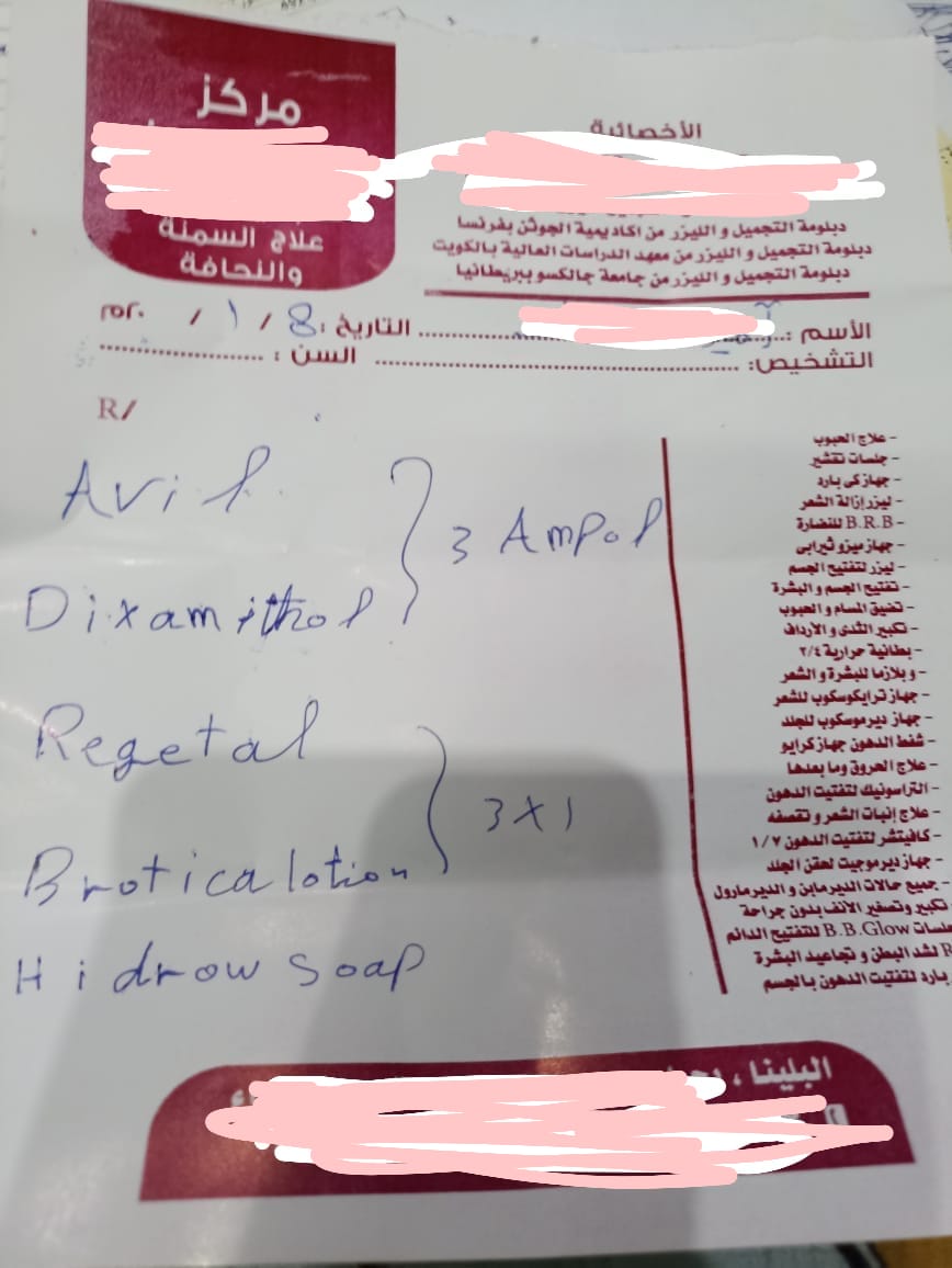 وتقوم بعلاج مرضى السمنة والنحافة وتفتيت الدهون وعمل جلسات تقشير وعلاج الأمراض الجلدية وجلسات ميزوثيرابي و إدعائها العلاج بالليزر.
