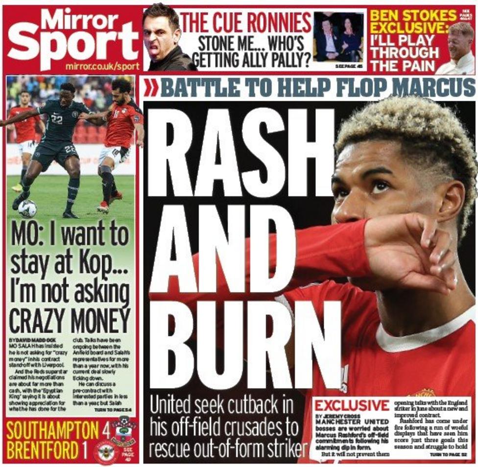 وبدورها عنونت "ميرور": "سقوط.. اليونايتد يستهدف تقليل أنشطته خارج الملعب لإنقاذ المهاجم المبتعد عن مستواه".