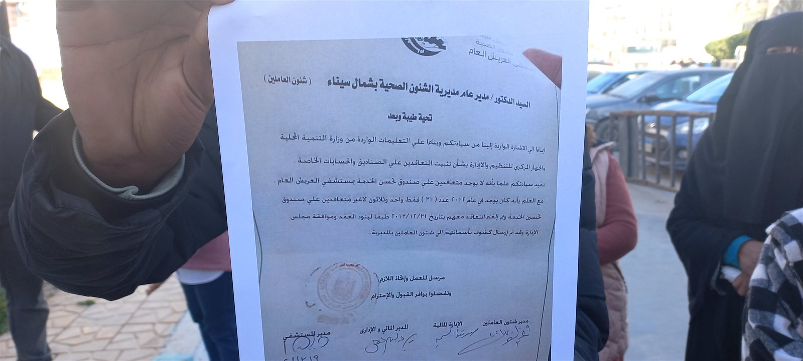 وطالب العاملين بضرورة تدخل المسؤلين بالمحافظة على رأسهم اللواء محمد عبد الفضيل شوشة محافظ شمال سيناء ووزارة الصحة والسكان وجميع المسؤلين قبل أن يضيع حق لنا لابد تحقيقه.