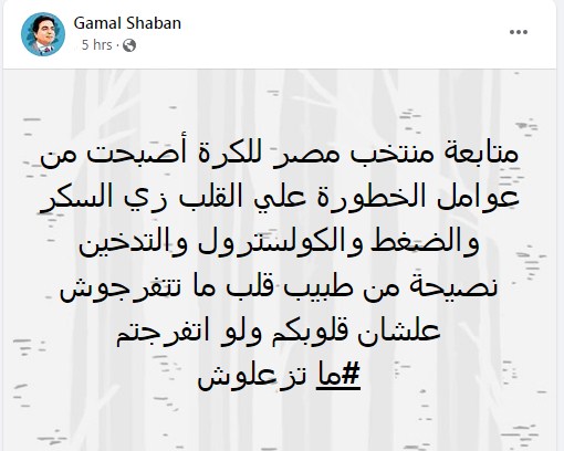 وكتب جمال شعبان تدوينة على الفيس بوك:"متابعة منتخب مصر للكرة أصبحت من عوامل الخطورة علي القلب زي السكر والضغط والكوليسترول والتدخين.. نصيحة من طبيب قلب ما تتفرجوش علشان قلوبكم ولو اتفرجتم #ما تزعلوش".