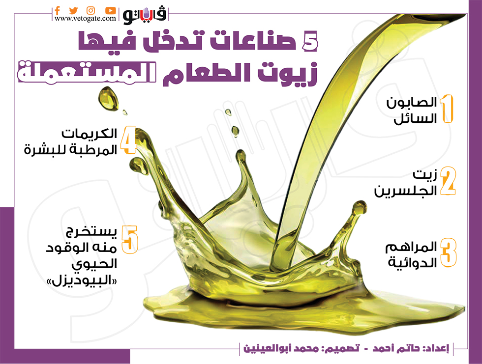 5 صناعات تدخل فيها زيوت الطعام المستعملة |انفوجراف الجمعة 14/يناير/2022 - 03:48 م 1/14/2022 3:48:02 PM زيوت الطعام المستعملة حاتم أحمد شارك طباعة 18 حجم الخط شارك طباعة الزيوت المستعملة صناعة الصابون السائل زيت الجلسرين صناعة الكريمات المرطبة للبشرة البيوديزل