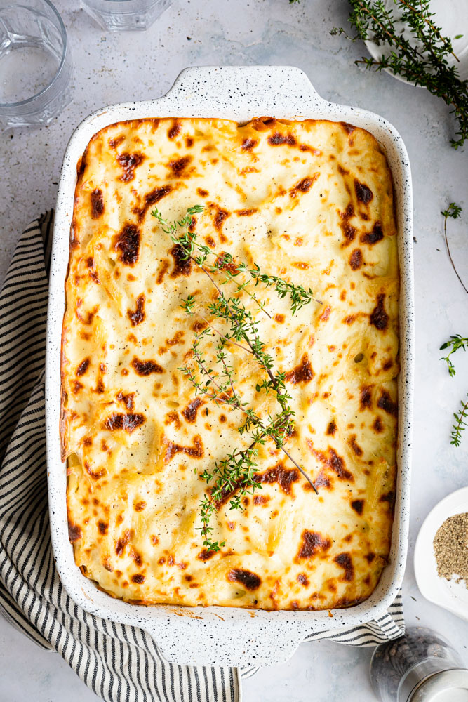 - نتبل البشاميل بالملح والفلفل وجوز الطيب ومكعب المرق، ونضيف له الجبن بأنواعه ونقلب حتى يذوب الجبن، ثم نرفعه من على النار، ونتركه يبرد قليلا ثم نضيف البيضة ونقلب.