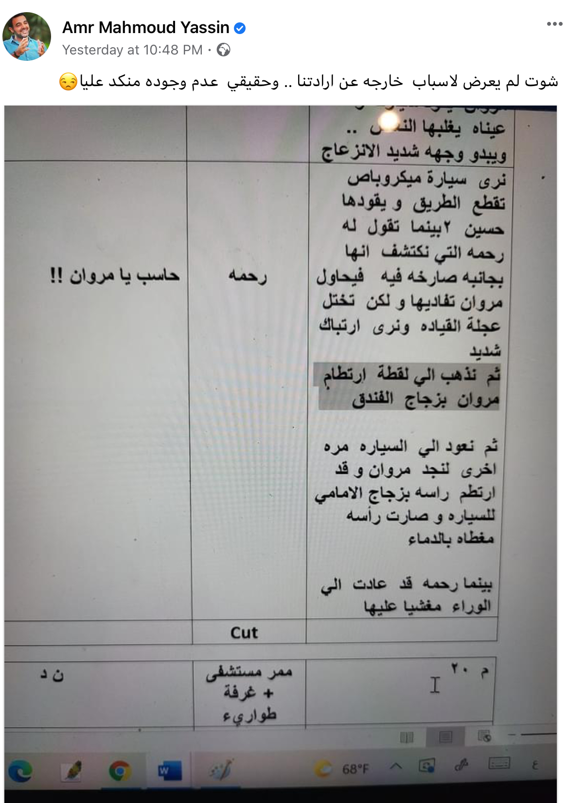 وشارك عمرو محمود ياسين متابعيه عبر صفحته الشخصية بموقع التواصل الاجتماعي فيس بوك صورة من الإسكربت الخاص بحكاية اعمل نفسك ميت، وتحديدا مشهد لم يعرض في الحلقة الأخيرة من حكاية اعمل نفسك ميت وعلق على الصورة قائلا: شوت لم يعرض لأسباب خارجة عن إرادتنا وحقيقي عدم وجوده منكد عليا.