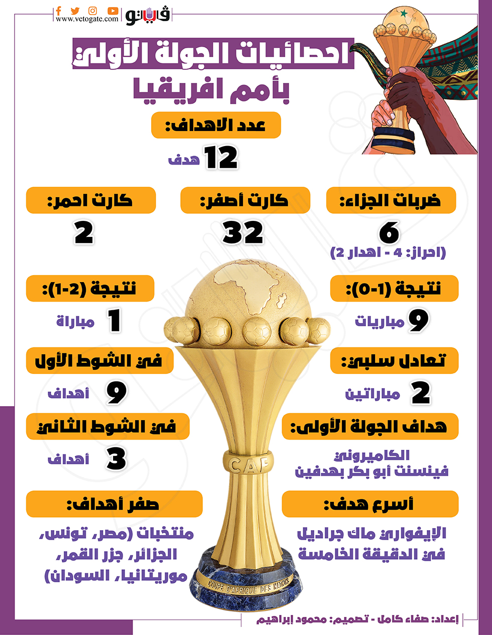 احصائيات الجولة الاولي بامم افريقيا|انفو جراف الخميس 13/يناير/2022 - 02:49 م 1/13/2022 2:49:01 PM امم افريقيا صفاء كامل شارك طباعة 18 حجم الخط شارك طباعة كأس أمم أفريقيا الجولة الاولي عدد الاهداف ضربات الجزاء