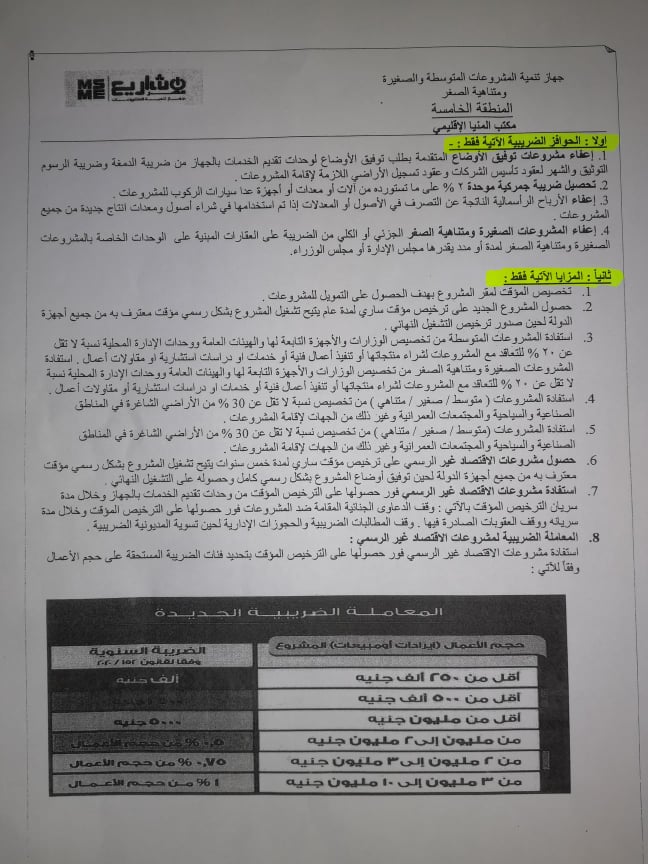 وناشد نائب المحافظ، أصحاب المشروعات غير رسمية بكافة مراكز ومدن المحافظة بسرعة التوجه إلى جهاز تنمية المشروعات بمدينة المنيا للبدء في إجراءات توفيق الأوضاع والحصول على رخصة مؤقتة تتراوح من سنة إلي 5 سنوات، وذلك بالإضافة إلي الحصول علي عدد من المزايا والحوافز الضريبية.