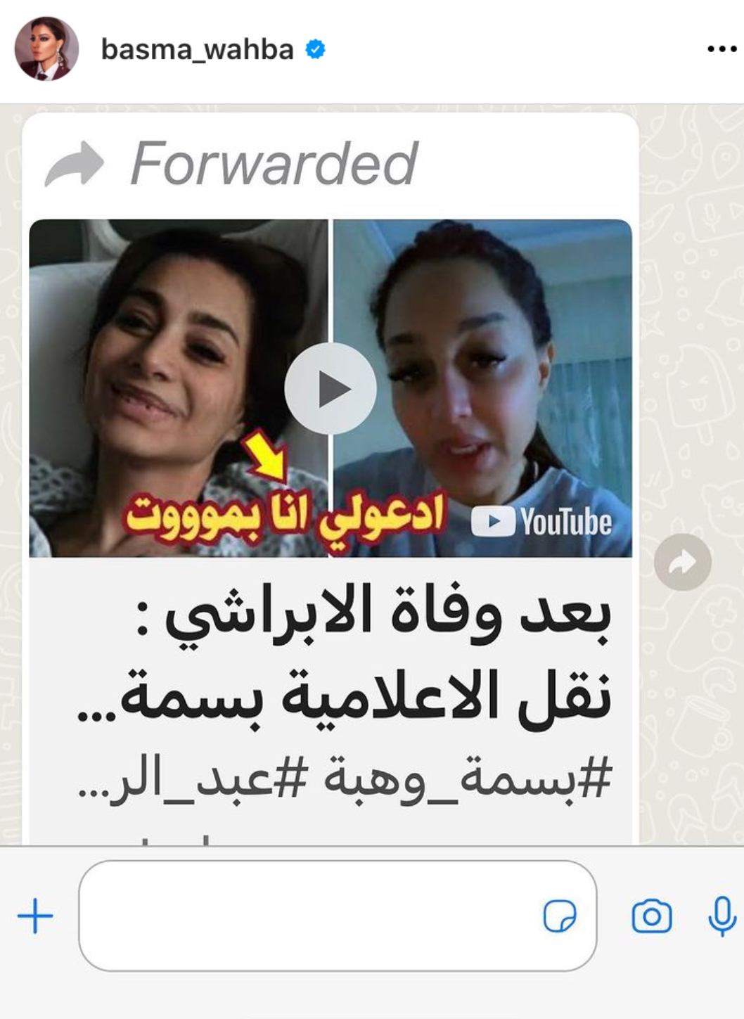 وكتبت بسمة وهبة على حسابها الشخصي بـ انستجرام منذ قليل: بترجاكم بلاش إشاعات لأن الوقت ده الواحد بيبقى محتاج كلمة تشجعه مش إشاعة تزعله وبلاش عناوين بتلميحات سلبية بلاش تحطمونا وتستغلونا من أجل لايك وشير، بعد وفاة الإبراشي بسمة وهبة في المستشفى.