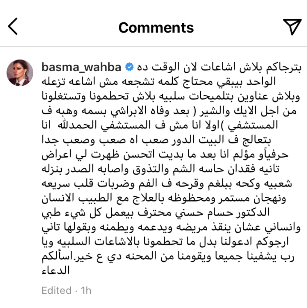 وأضافت بسمة وهبة: وبقولها تاني أرجوكم أدعولنا بدل ما تحطمونا بالإشاعات السلبية ويا رب يشفينا جميعًا ويقومنا من المحنة دي على خير أسألكم الدعاء.