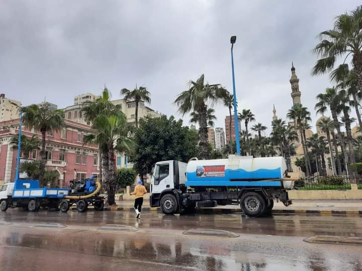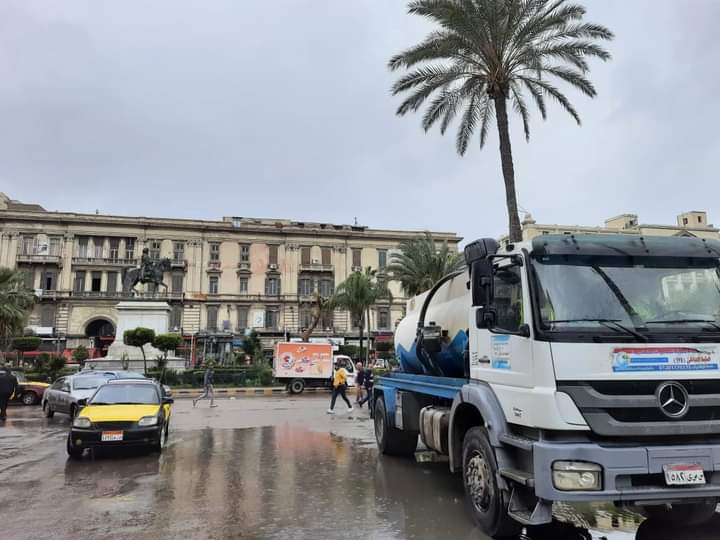 سيارات الصرف الصحي بالإسكندرية تواصل شفط مياه الأمطار في الميادين