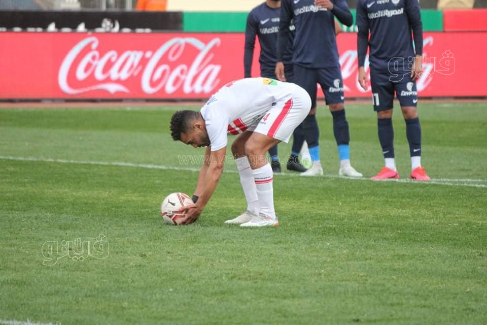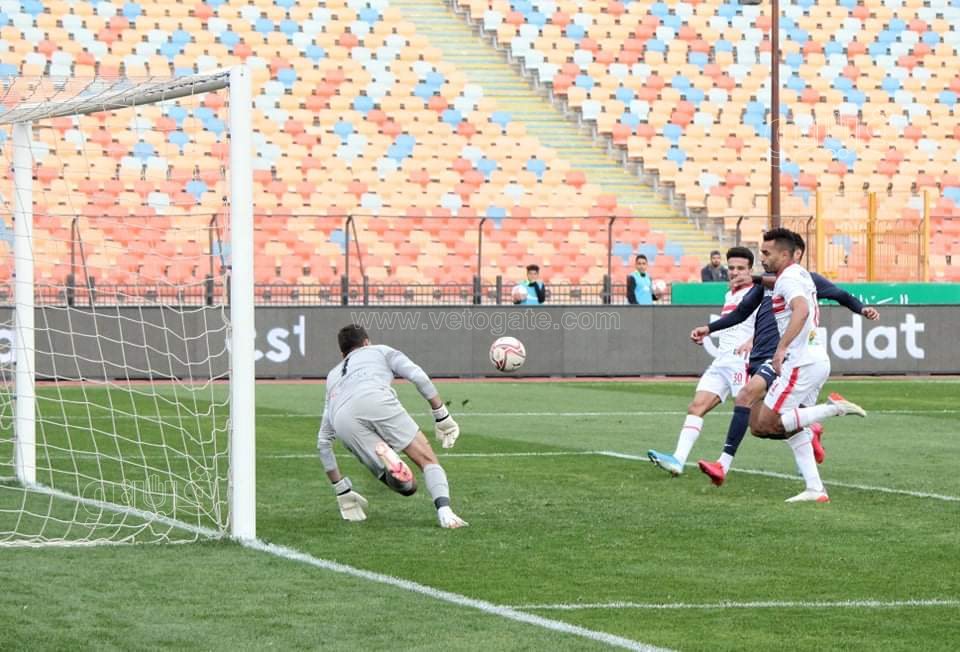 احتسب الحكم ضربة جزاء للزمالك في الدقيقة 67 بعد اللجوء لتقنية الفار إثر اعتراض محمد حامد قدم حازم إمام.