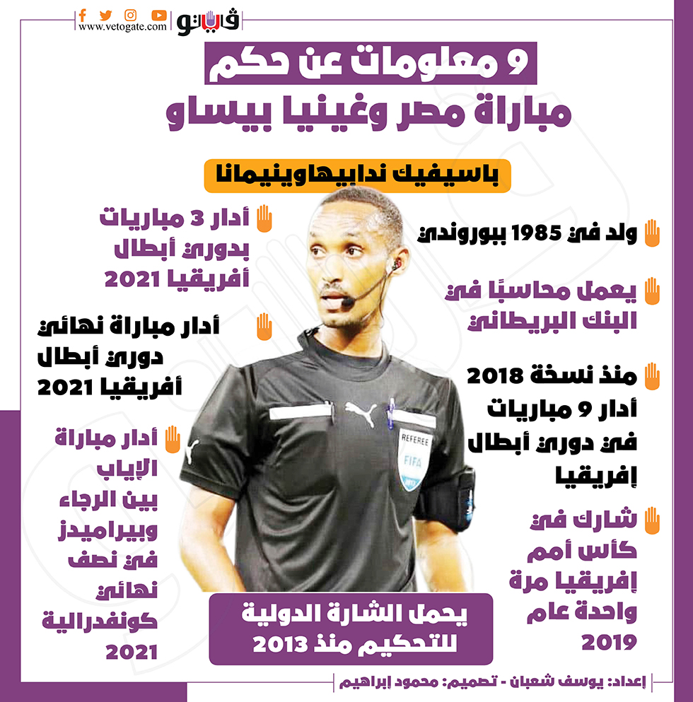 9 معلومات عن حكم مباراة مصر وغينيا بيساو | انفوجراف السبت 15/يناير/2022 - 04:49 م 1/15/2022 4:49:23 PM الحكم البوروندي باسيفيك ندابيهاوينيمانا يوسف شعبان شارك طباعة 18 حجم الخط شارك طباعة منتخب مصر منتخب غينيا بيساو بطولة أمم أفريقيا الحكم البوروندي باسيفيك ندابيهاوينيمانا لجنة الحكام بالكاف
