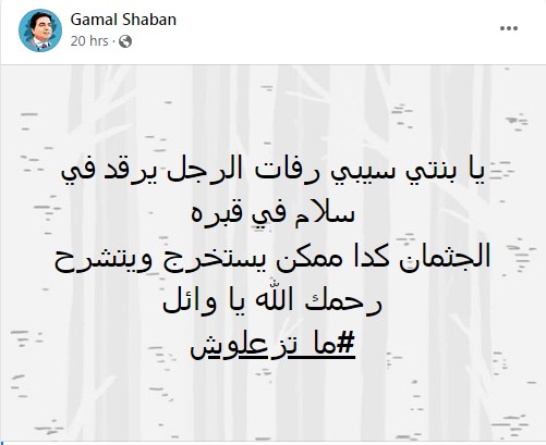 وكتب جمال شعبان تدوينة على الفيس بوك "يا بنتي سيبي رفات الرجل يرقد في سلام في قبره الجثمان كدا ممكن يستخرج ويتشرح رحمك الله يا وائل #ما_تزعلوش".
