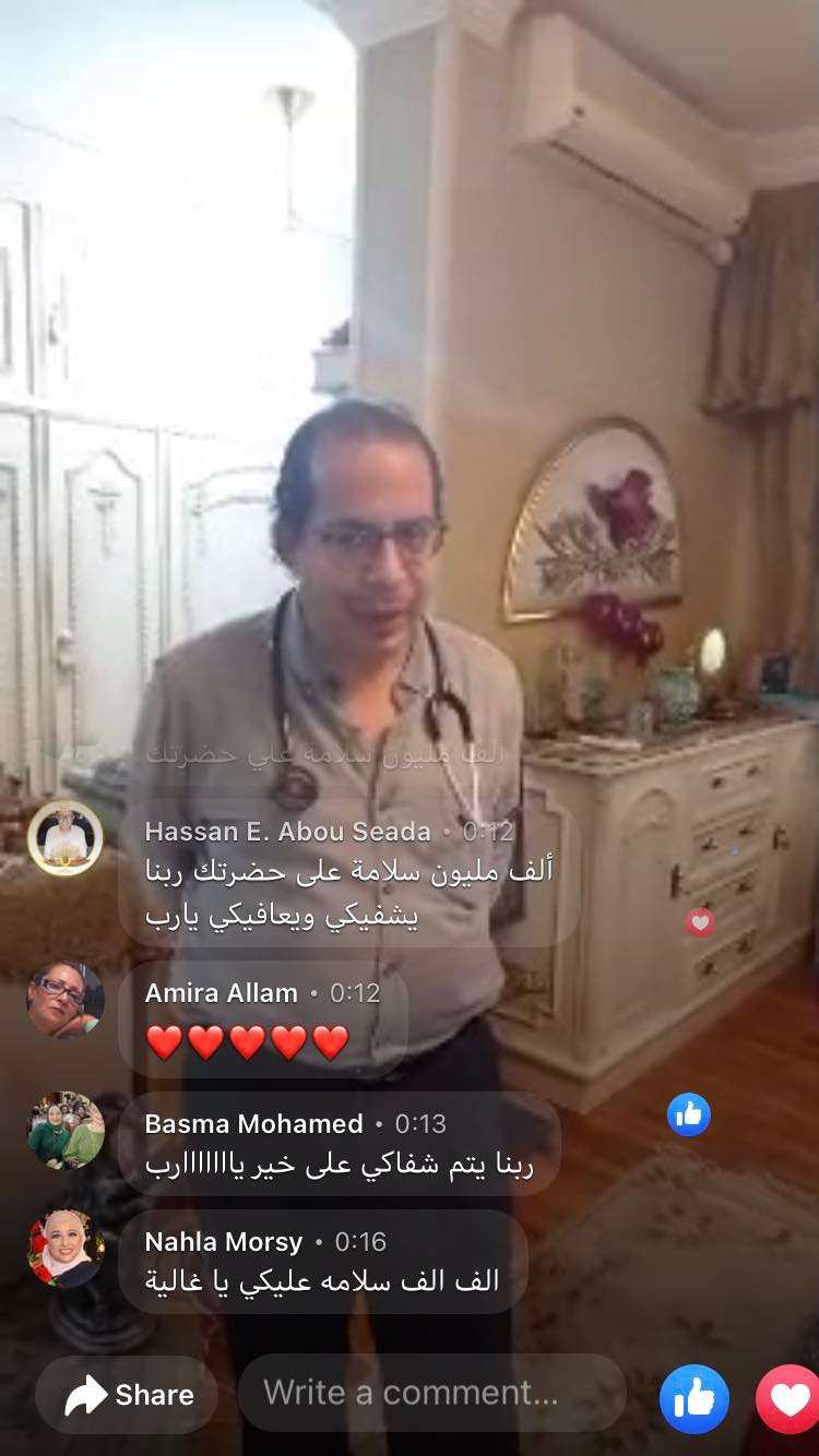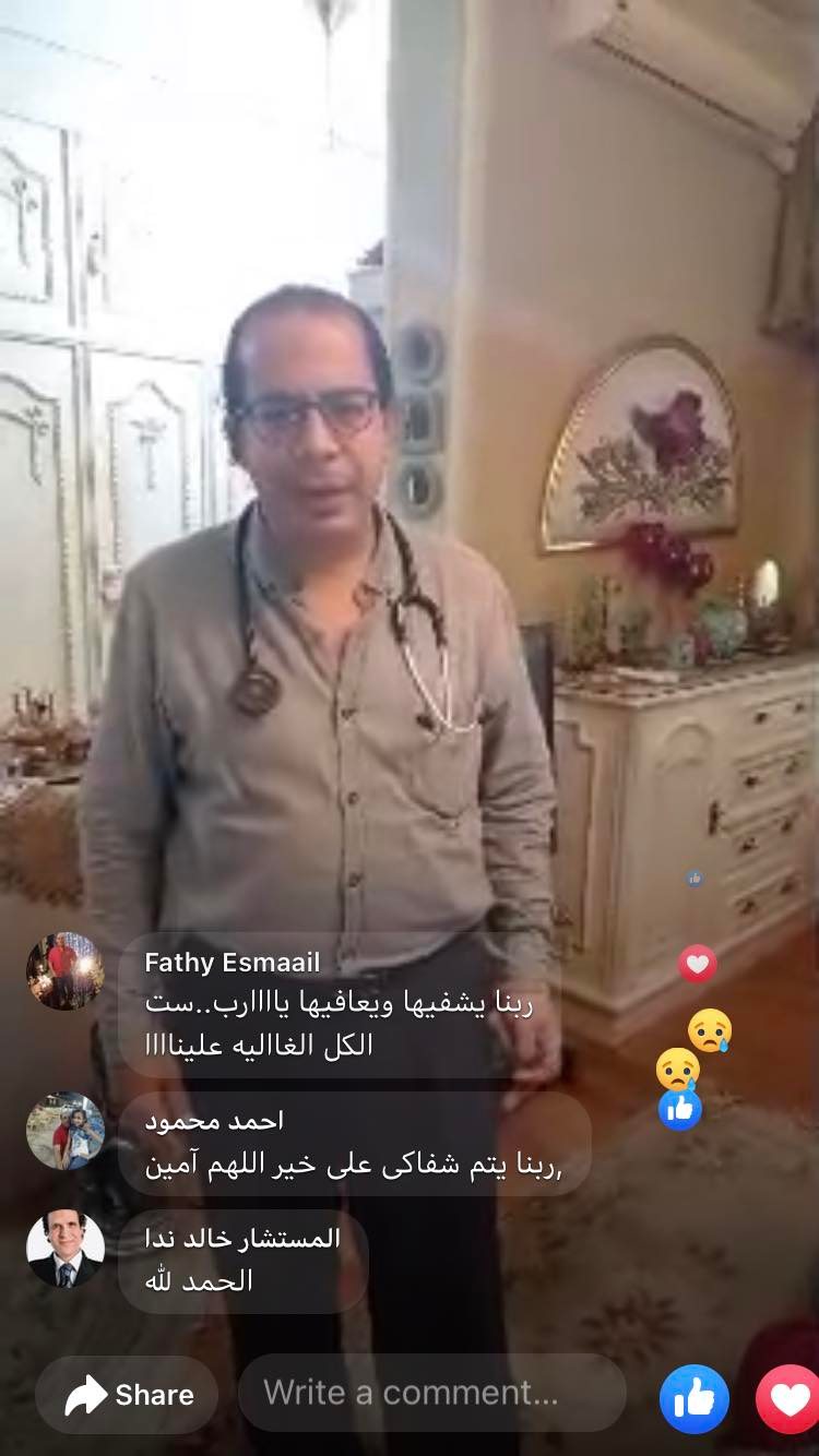 وواصل: هنكمل فترة العزل لـ 10 أيام عادي جدا لحد التحسن والشفاء التام، بس الحمدلله هي حالتها كويسة وحالة الصدر والأكسجين والتنفس كويسين، ومفيش أي مشاكل في الجهاز التنفسي خالص.