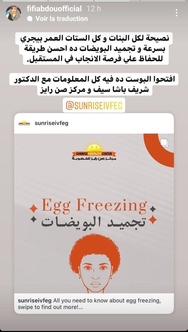 أثارت الفنانة والراقصة فيفي عبده الجدل على مواقع التواصل الاجتماعي "إنستجرام" بنشرها "ستوري" يشجِّع على تجميد البويضات الأنثوية.