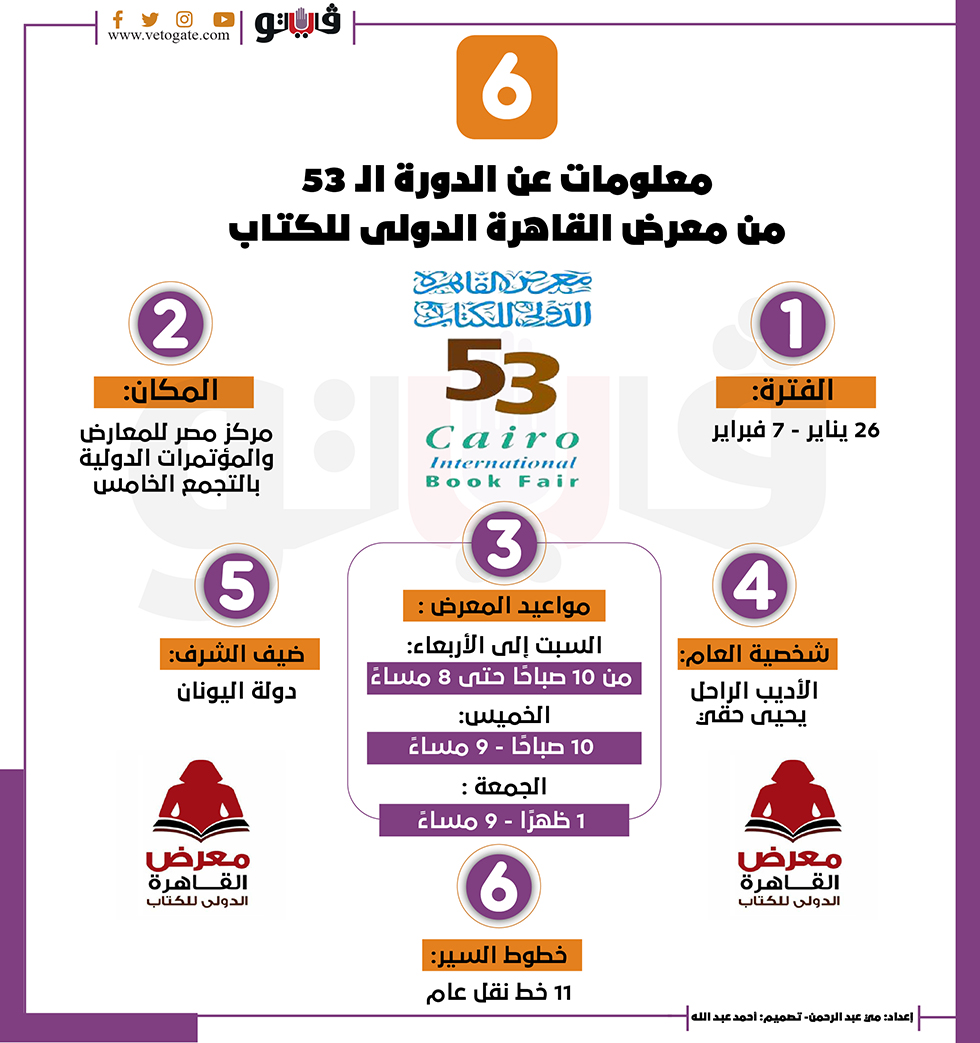 6 معلومات عن الدورة الـ 53 من معرض القاهرة الدولى للكتاب | انفوجراف الأحد 16/يناير/2022 - 04:06 م 1/16/2022 4:06:22 PM معرض القاهرة الدولي للكتاب مي عبدالرحمن شارك طباعة 18 حجم الخط شارك طباعة