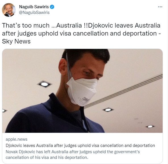 وكتب المهندس نجيب ساويرس تغريدة على تويتر قائلًا: "هذا كثير جدًا يا أستراليا.. مغادرة جوكوفيتش أستراليا بعد الحكم بإلغاء التأشيرة والترحيل".