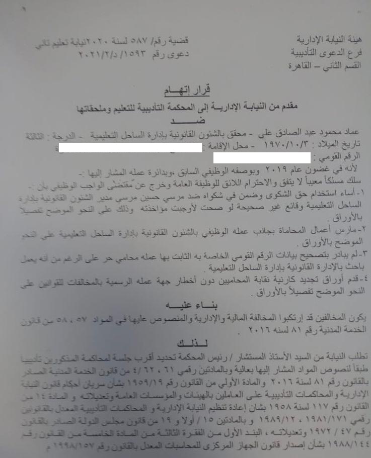كشف تقرير الإتهام المقدم من النيابة الادارية الي المحكمة التأديبية للتعليم وملحقاتها أن عماد محمود عبد الصادق، محقق بالشئون القانونية بإدارة الساحل التعليمية، التابعة لمديرية التربية والتعليم بالقاهرة في غضون عام ٢٠١٩ وبوصفه الوظيفي وبدائرة عمله سلك مسلكًا معيبًا لا يتفق والإحترام اللائق للوظيفة العامة وخرج عن مقتضي الواجب الوظيفي