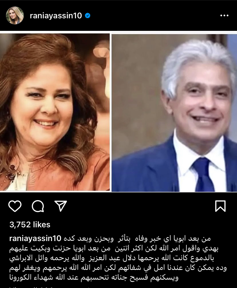 ونشرت رانيا محمود ياسين صورة لدلال عبد العزيز ووائل الإبراشي، وعلقت عليها قائلة: "من بعد أبويا أي خبر وفاة بتأثر وبحزن وبعد كده بهدى وأقول أمر الله".
