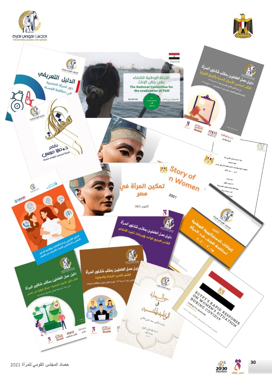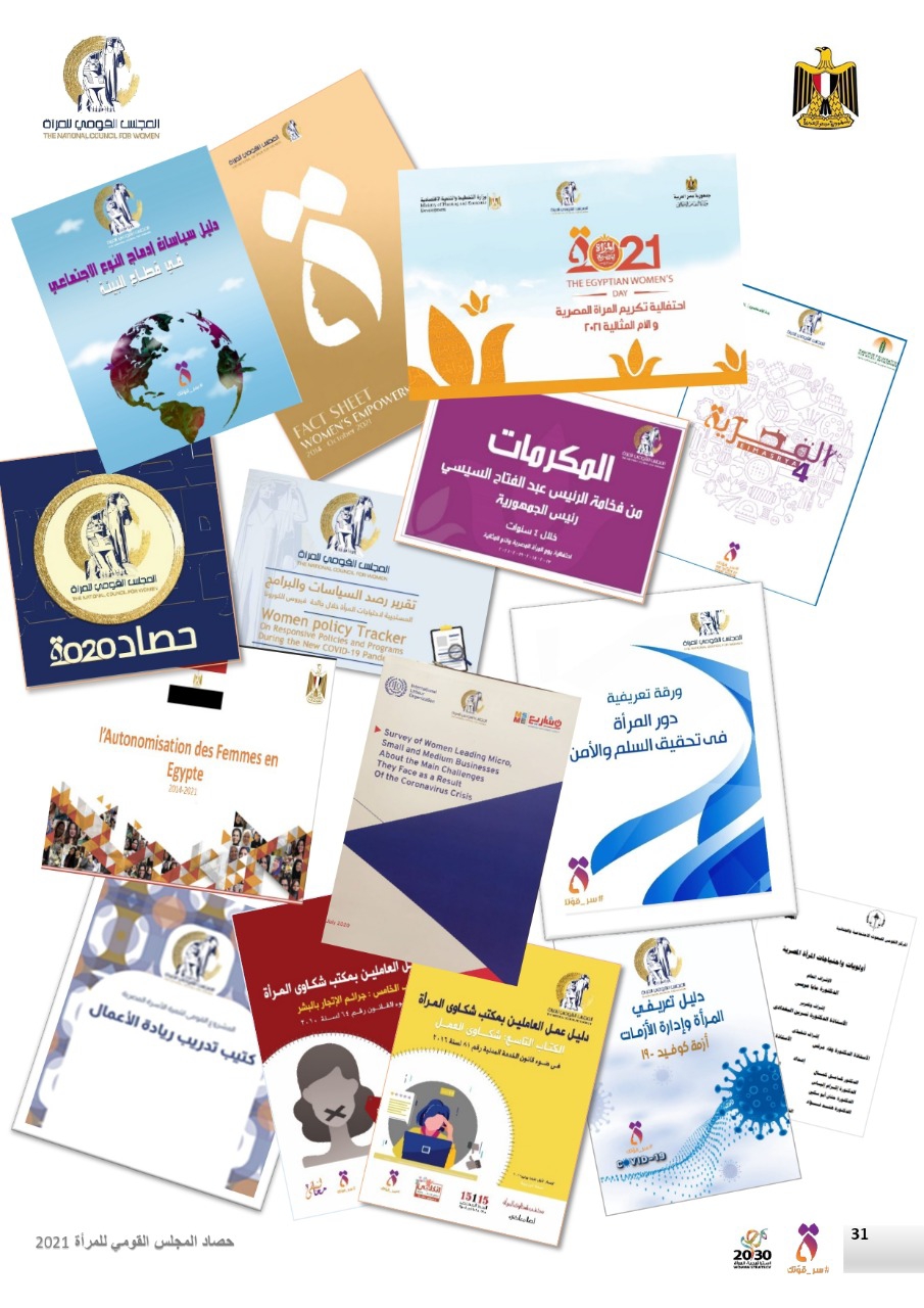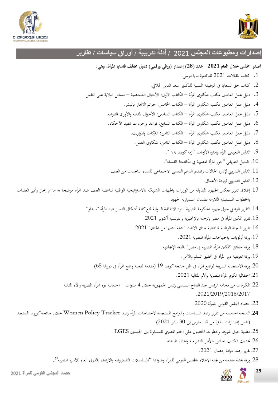 وتستعرض السطور التالية إصدارات ومطبوعات المجلس 2021 / أدلة تدریبیة / أوراق سیاسات / تقاریر، حيث أصدر المجلس خلال العام 2021 عدد (28) إصدار (ورقي ورقمي) تناول مختلف قضايا المرأة، وهي: